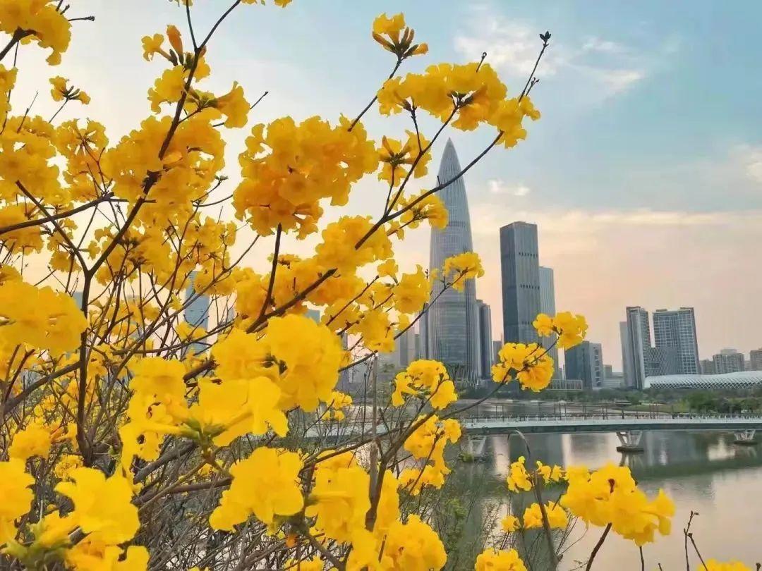黄花风铃木俏丽、醒目,紫花风铃木娇柔、秀美,她们有一个特别的花语——感谢。枝头盛放的花朵每一次随风摆动,翩翩起舞,就好像是呢喃着谢语,替所有南山人感谢“天使白”“志愿红”“卫士蓝”,感谢你们,守护我们的岁月静好。