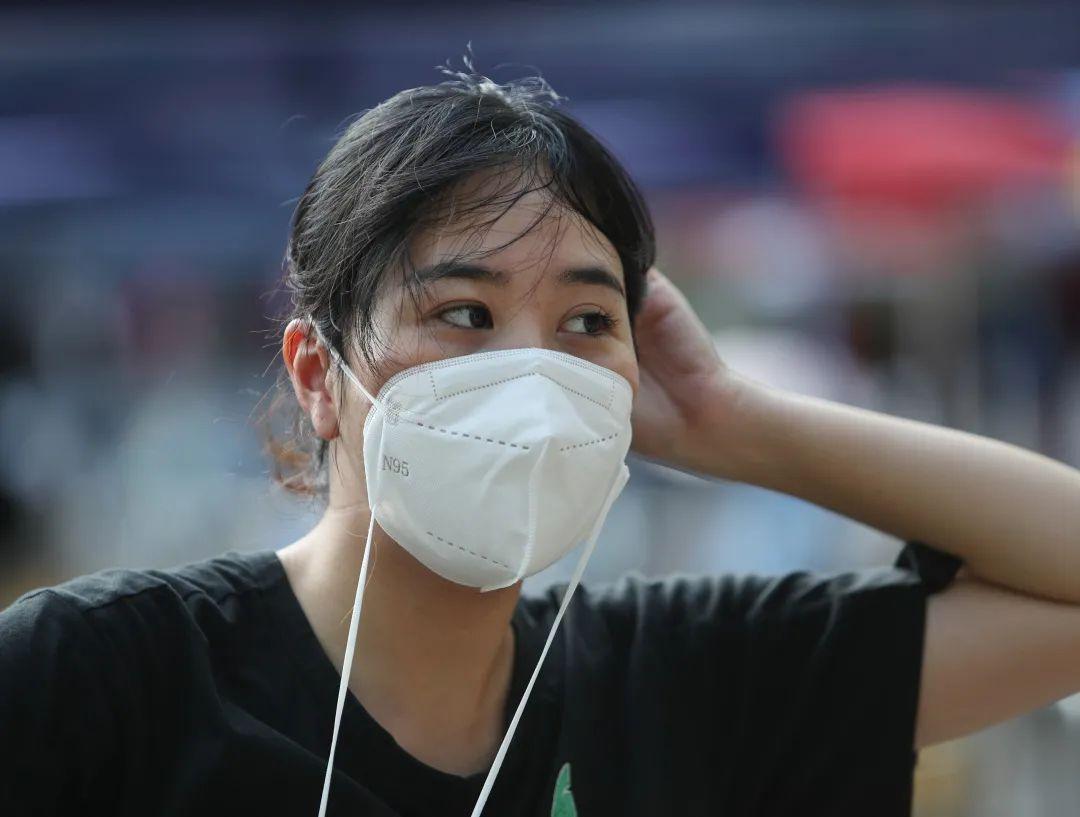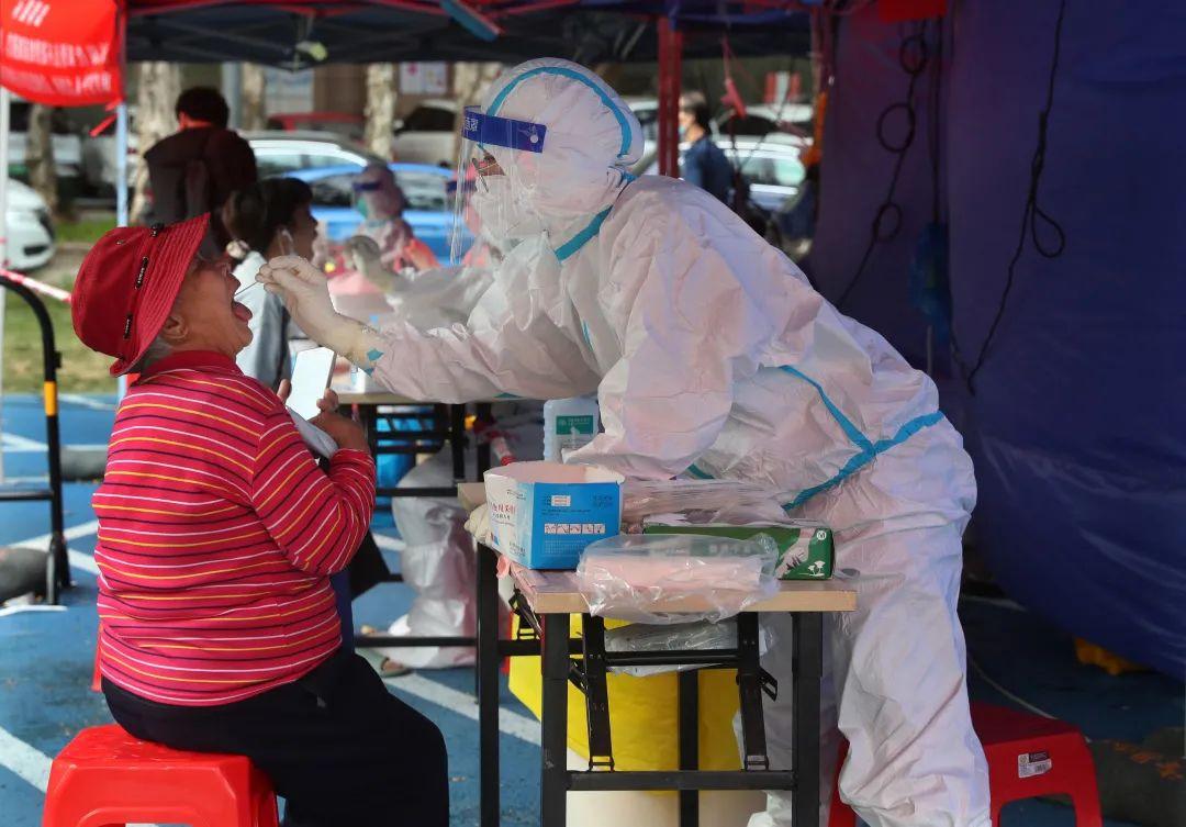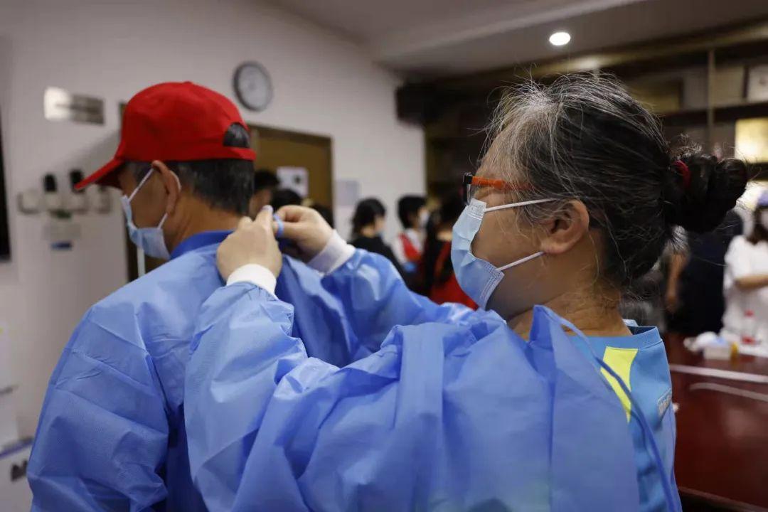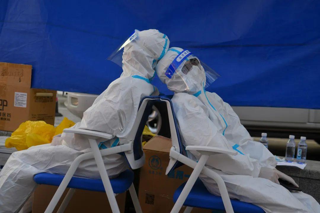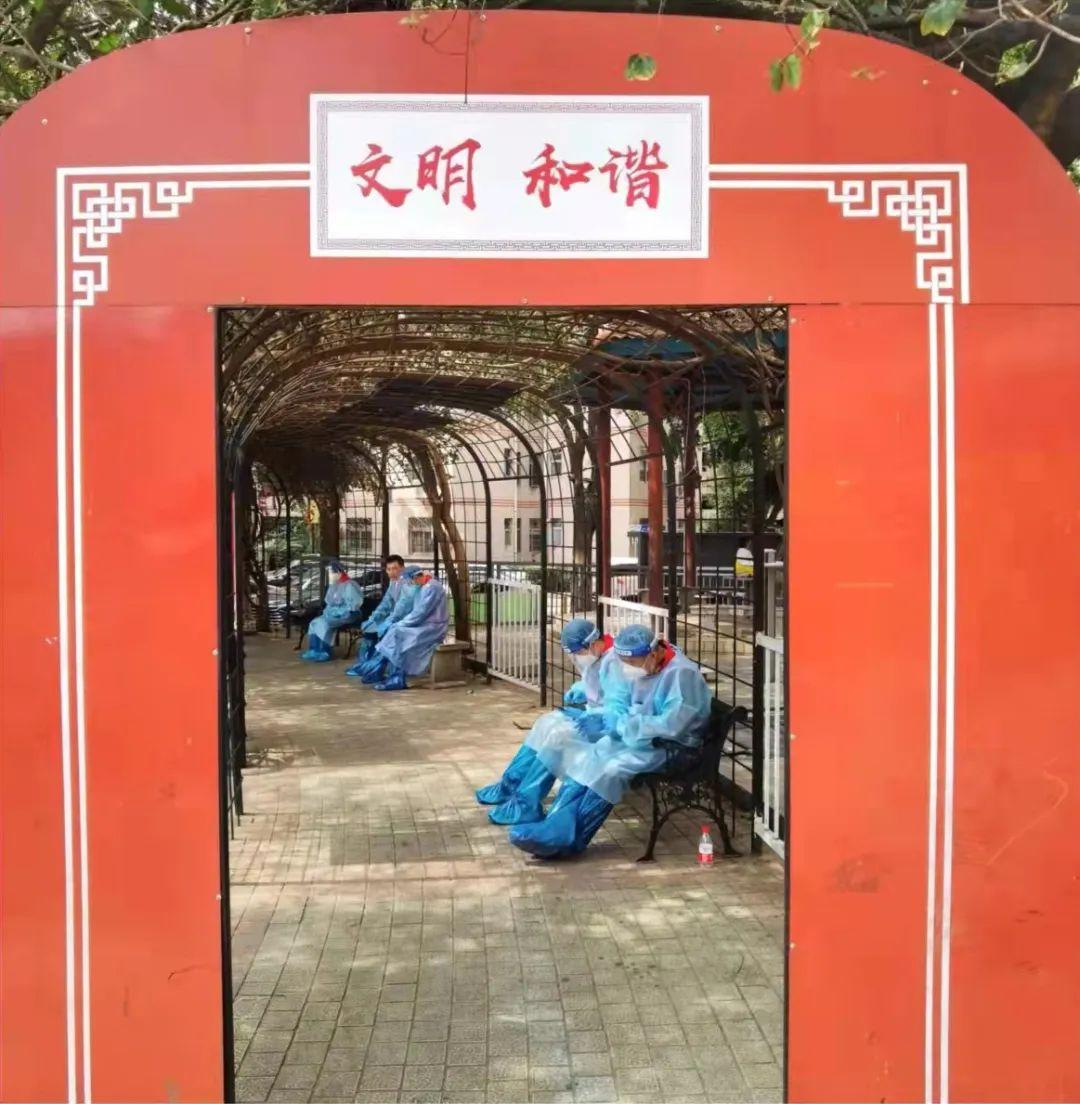 在高強度的检测工作中,罗湖区中医院两名护士背靠背休息一会。