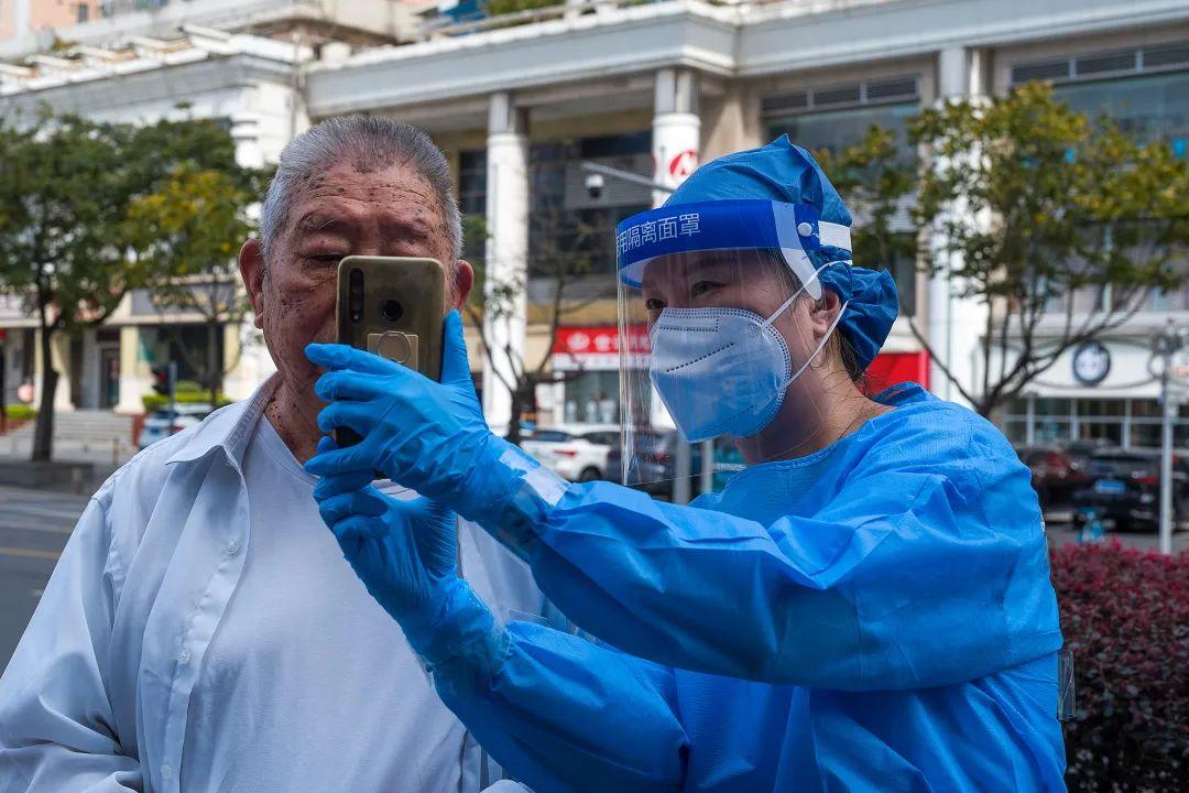 老党员周和南、林玉凤帮助社区老人做核酸。