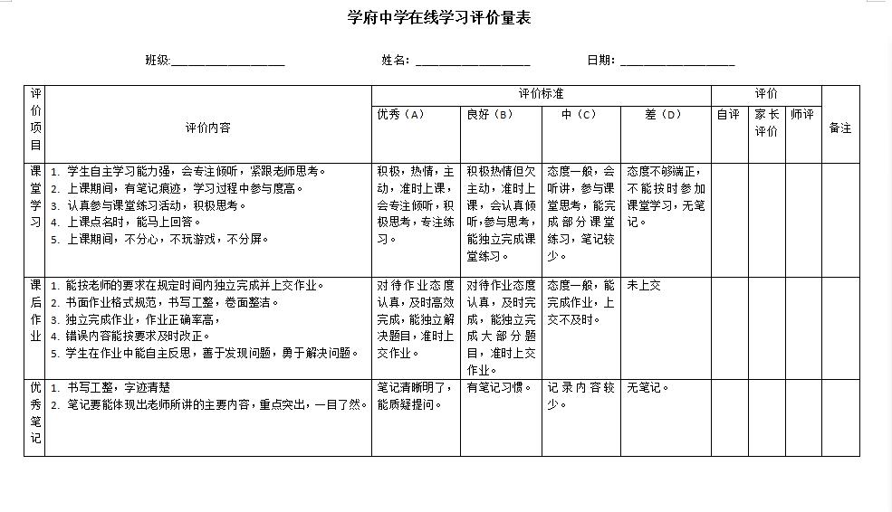 在校长陈铁成博士的带领下,学府中学有序、有力、有效地进行网课直播,实施小班化、精品化、个性化教学。为了能够全身心的投入学习,全体同学签订了《在线学习承诺书》。云教学、云背诵、云答题,师生互动精彩纷呈,停课不停“乐”。每日学习结束,在《学府中学在线学习评价表》进行自评、家长评价、教师评价总结。除了关心学生学习情况,还为学生、家长、教师召开网络心理调适讲座,帮助全校师生、家长更好地适应网课生活。