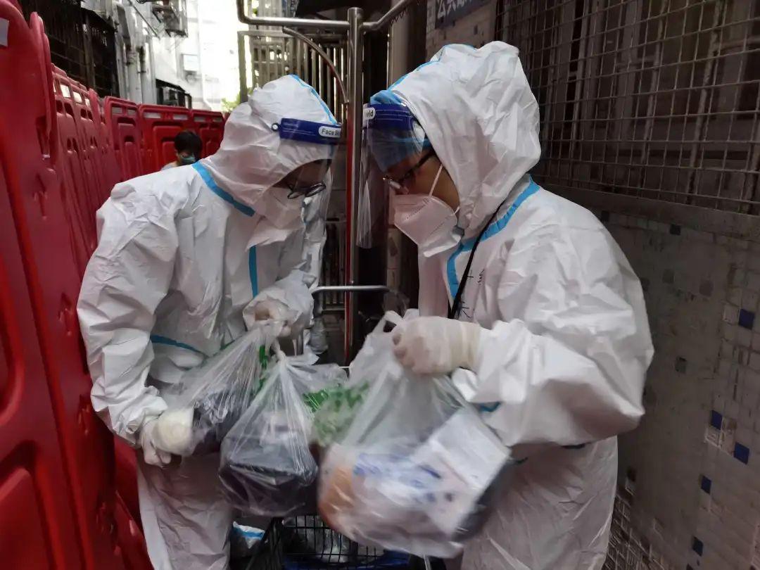 在赤尾村抗疫的期间,我和另一位龙岗工会干部2人负责2栋楼共93名居民的食物、快递、外卖等各类物资的配送工作,工作量其实挺大的。我们穿着防护服拿着饭盒在居民楼里爬上爬下,常常是大汗淋漓。