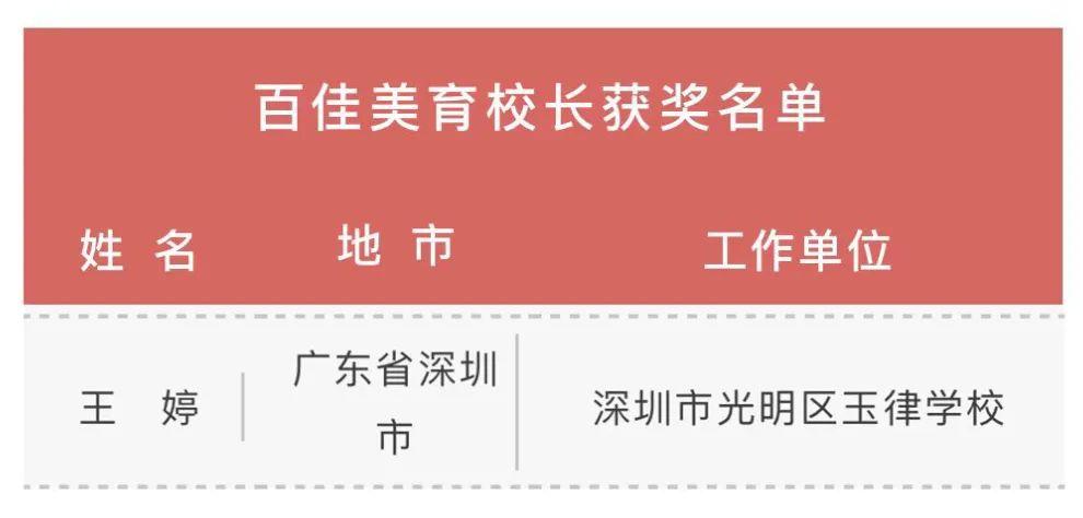 近日,2021年度“人美年度教育人物——百佳美育校长”获奖名单揭晓,深圳市光明区玉律学校王婷校长被评为全国“百佳美育校长”!