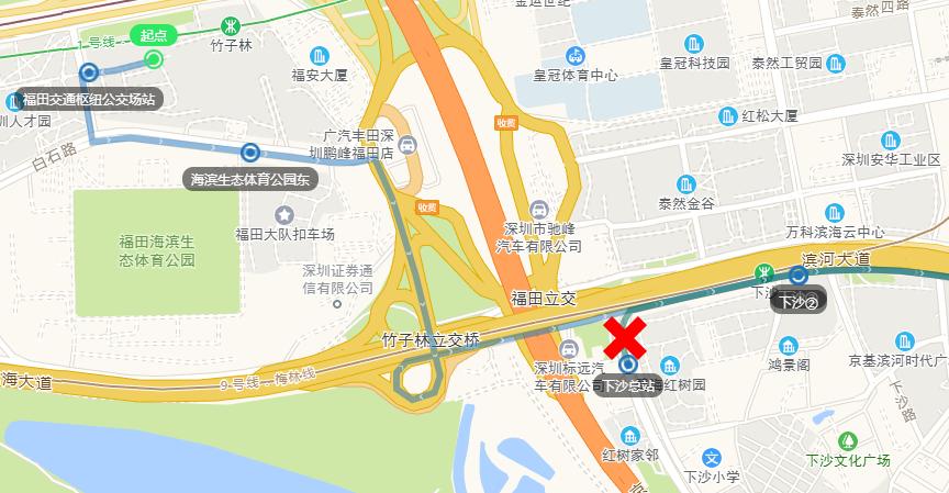 往福田交通枢纽公交场站方向取消“金海湾花园、上沙村”等2个单边公交停靠站,增加“海滨生态体育公园”1个单边公交停靠站。