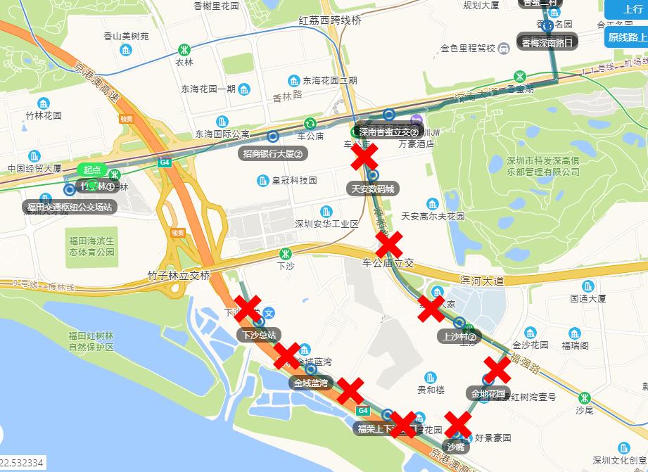 双方向取消“天安数码城、金地花园、沙嘴、福荣上下沙路口、金域蓝湾”等5对公交停靠站,增加“招商银行大厦”1对公交停靠站。