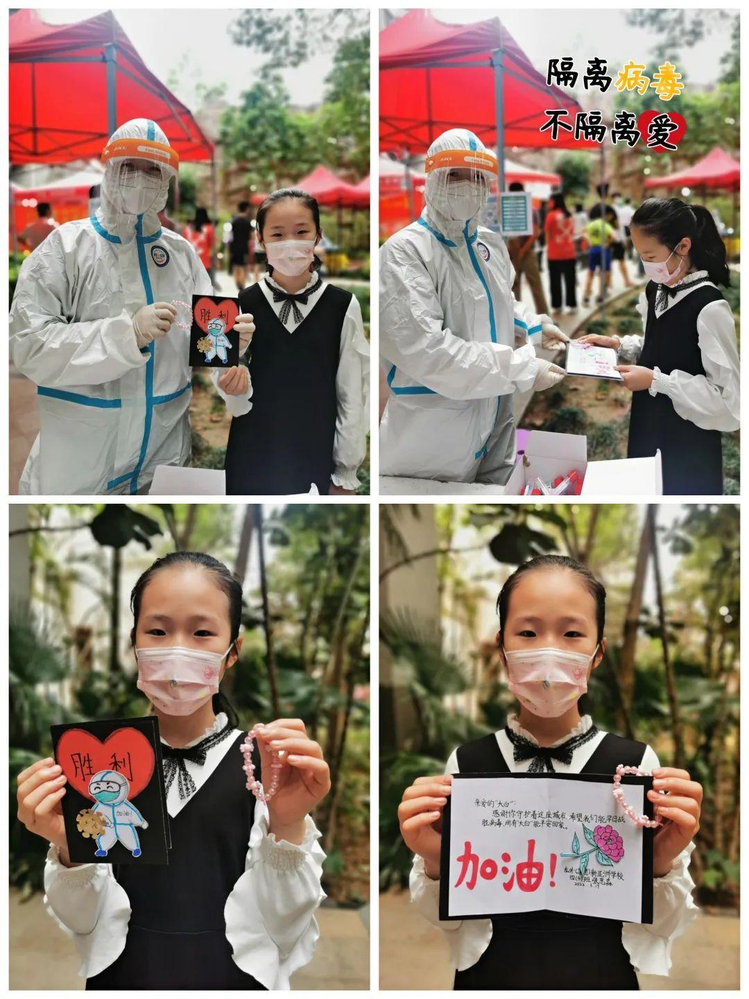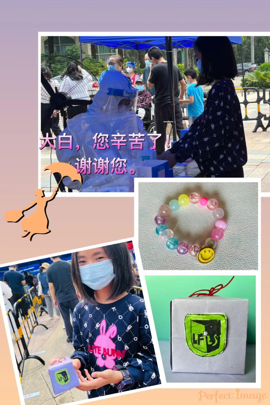 龙外(集团)新亚洲学校学生在云端劳动课程的指引下,纷纷动手编织起了手链,一线一珠子串起学子对抗疫战士们的敬意。在家长的带领下,学生在做核酸检测时将手链送给医护人员,通过自己方式表达感恩之心。孩子们说:“这次疫情感受到‘大白’的辛苦,我想送‘幸运手链’给他们,致敬抗疫英雄!”