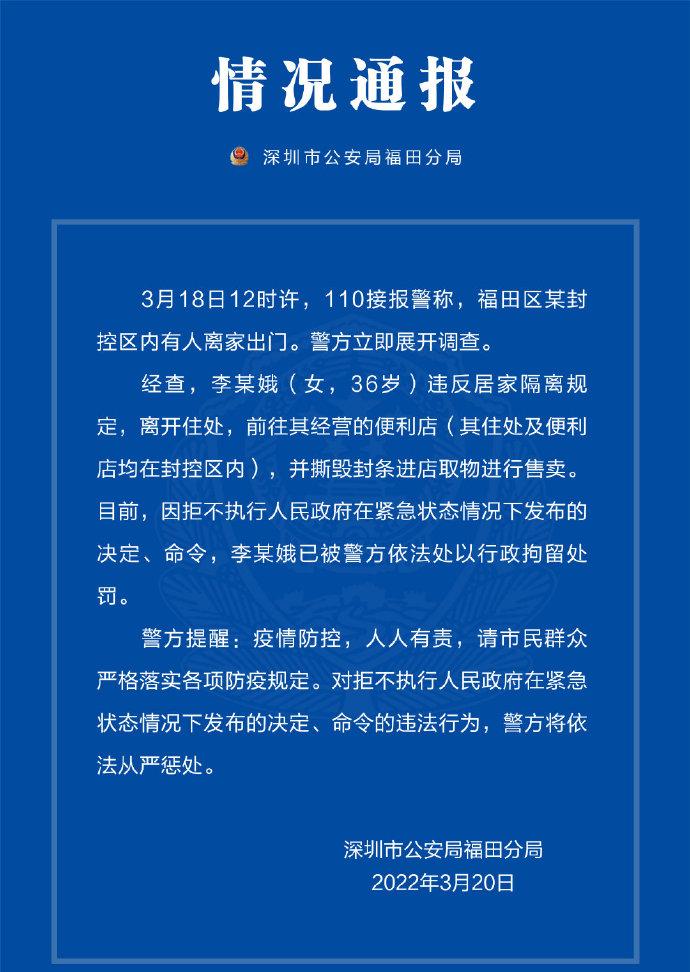 封控区内一女子违反居家隔离规定,离开住处,前往其经营的便利店,并撕毁封条进店取物进行售卖,被处以行政拘留处罚。