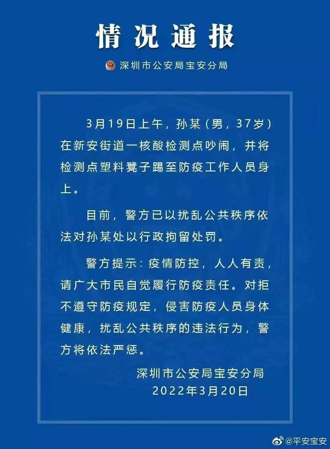 3月19日上午,孙某(男,37岁)在新安街道一核酸检测点吵闹,并将检测点塑料凳子踢至防疫工作人员身上。