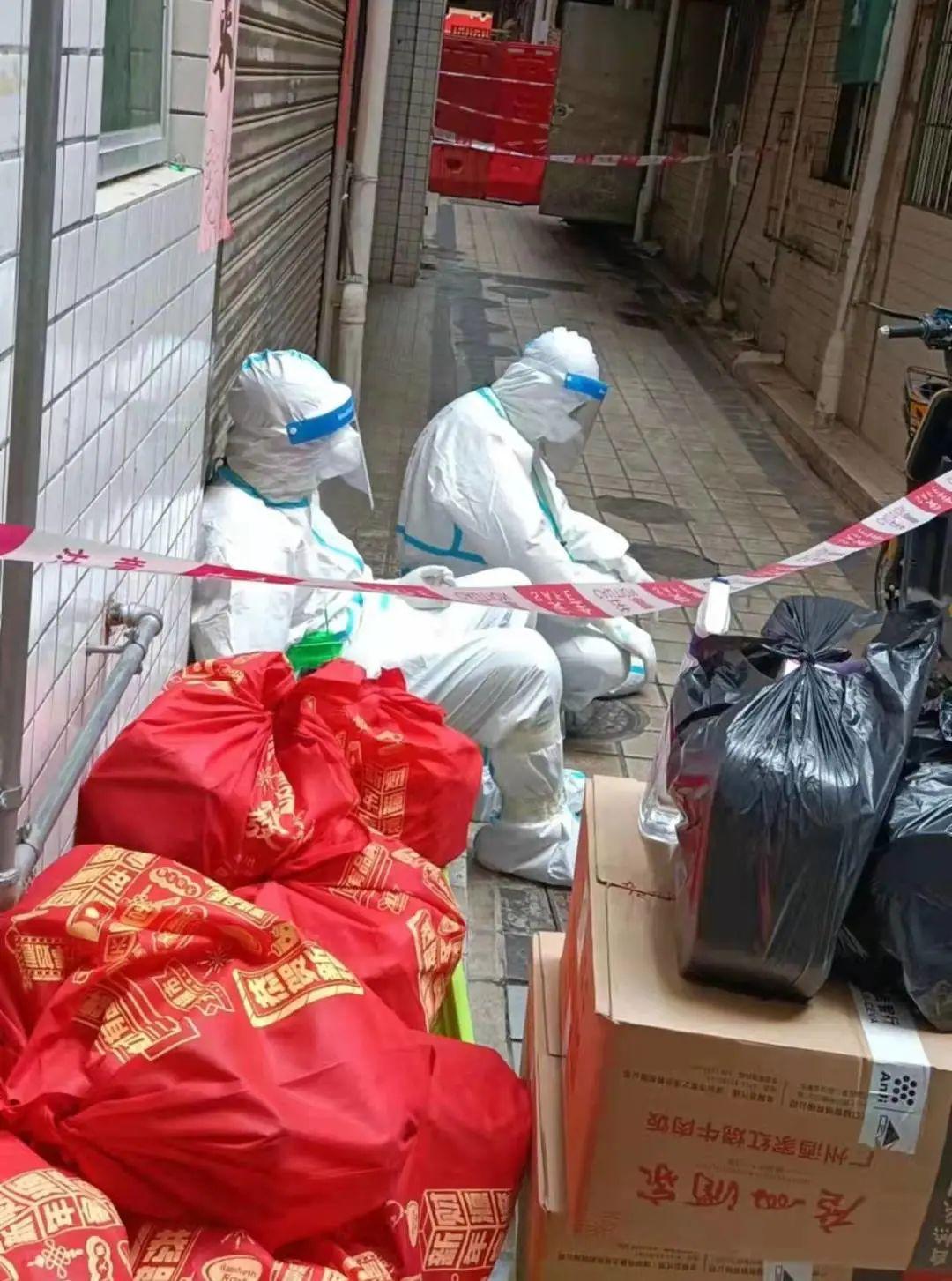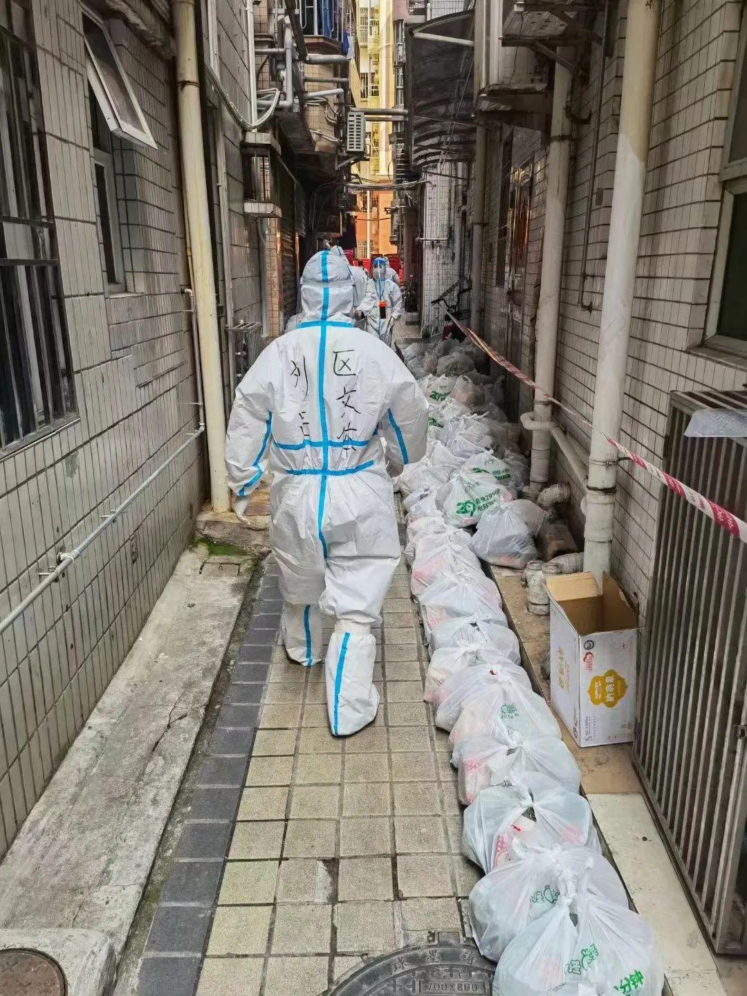 为了准时将生活物资分发到居民家中,志愿者们只能化身“传送带”,将物资从最外侧的马路,通过肩扛手提,一点一点运输到楼群里。他们就像活跃的“红细胞”,穿过“毛细血管”般的巷道,把希望和温度输送给每一位居民。