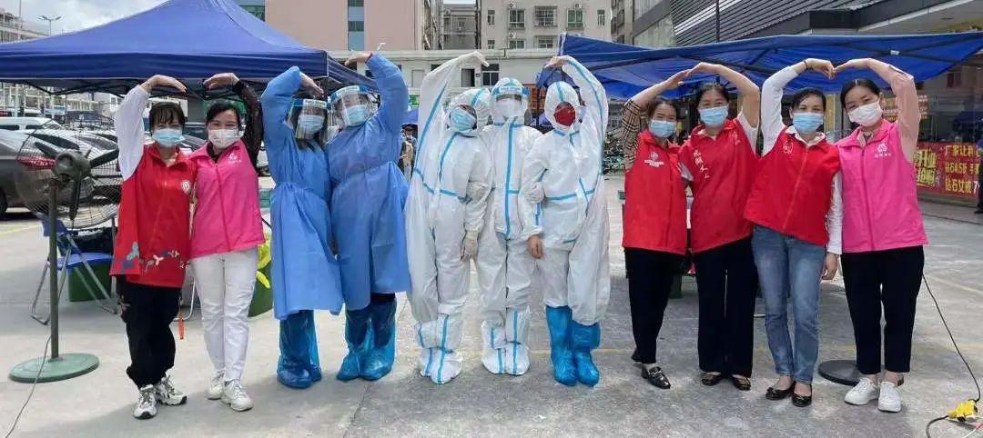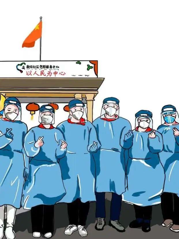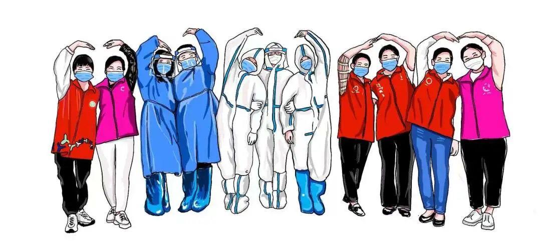 有的描述了一帮身穿隔离服的志愿者们,他们在社区工作站前站立比心,为抗疫胜利树立信心......