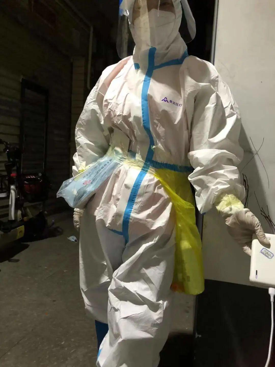 照片中,一名身着白色防护服、戴着防护口罩的医生正在流动核酸检测点给居民采集核酸样本,一名社区工作人员举起临时灯棒,头顶上的灯光照射下来,仿佛带上了光环。