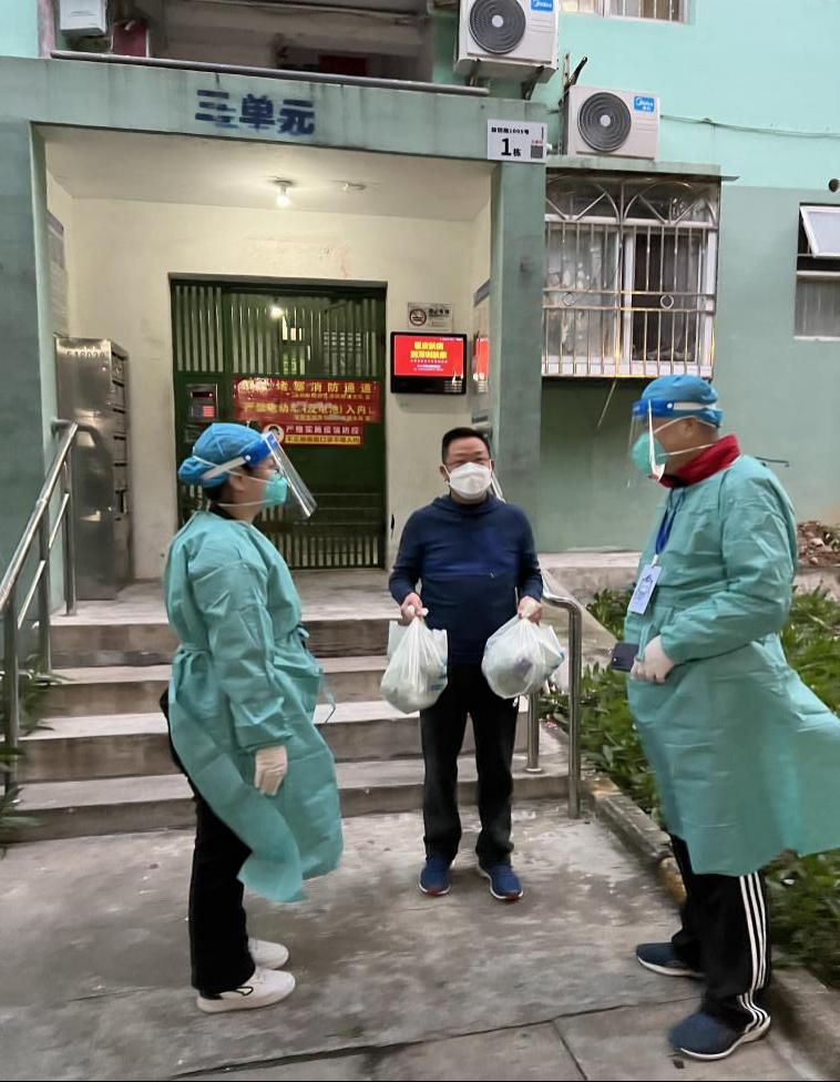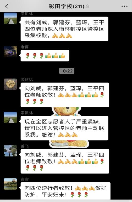 彩田学校党总支书记、校长徐连佳,副校长李强及教务主任范文东居住在益田村,2月26日,防疫形势突变,益田村被列为封控区。面对病毒肆虐,三位同志积极参加志愿者,投身到小区的抗疫中去,校长徐连佳和教务主任范文东身穿防护服,加入了“关心关爱组”,副校长李强加入了“文宣组”,扫楼,登记,流调,运送物资,哪里需要就往哪里冲,从早上七点干到深夜,才拖着疲惫的身体回家。