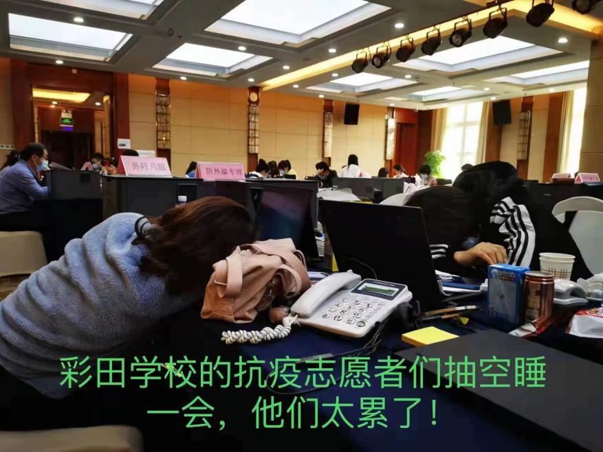 他们在社区的安排下,参加流调筛查,从早上7点一直持续工作至晚上十一二点,起早贪黑地战斗在抗疫一线。睡眠时间不够,就趁休息空档趴在桌子上小睡一会,然后继续投入到忙碌的流调工作中。