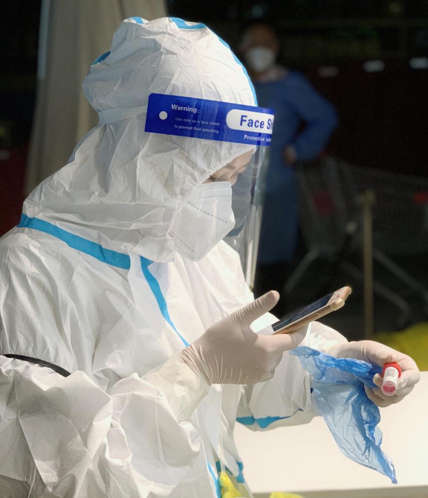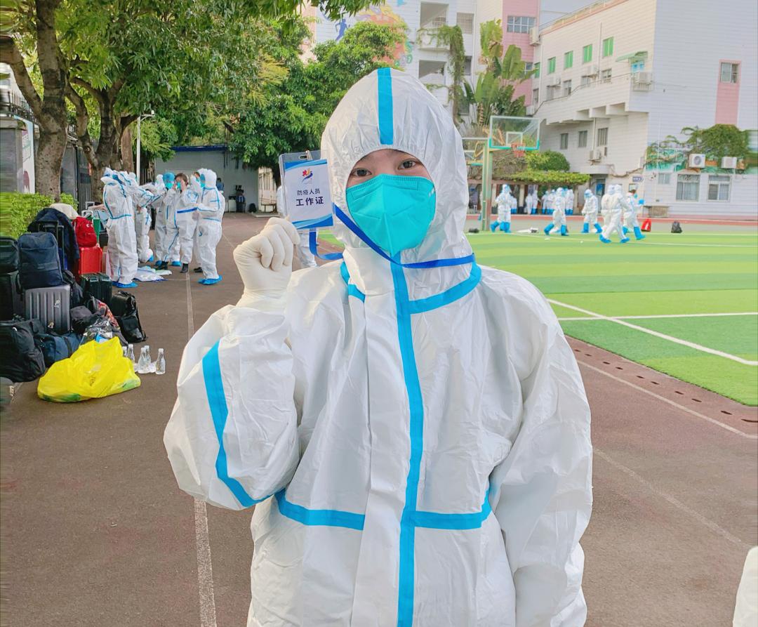 这几天,每天高负荷工作,心里的压力已到达了极点,疫情从未离我如此之近。但我在不知不觉中已经成长,从看到黄码红码的居民下意识后退几步,到淡定的给红码居民做核酸,安慰黄码居民做几次核酸码就会绿了,为居民解决日常生活问题。是这些居民给了我力量,在我一层层扫楼时,居民递给我的水果和牛奶;在我核对信息时,居民说的“谢谢”。也是我的搭档们,在进行任务前,帮我整理防护服的老师;在漆黑的巷子里,拉着我前进的医生姐姐。在这里我看到了中国人骨子里的团结,那是一种无与伦比的力量,它带着我们克服了一个又一个的困难。
