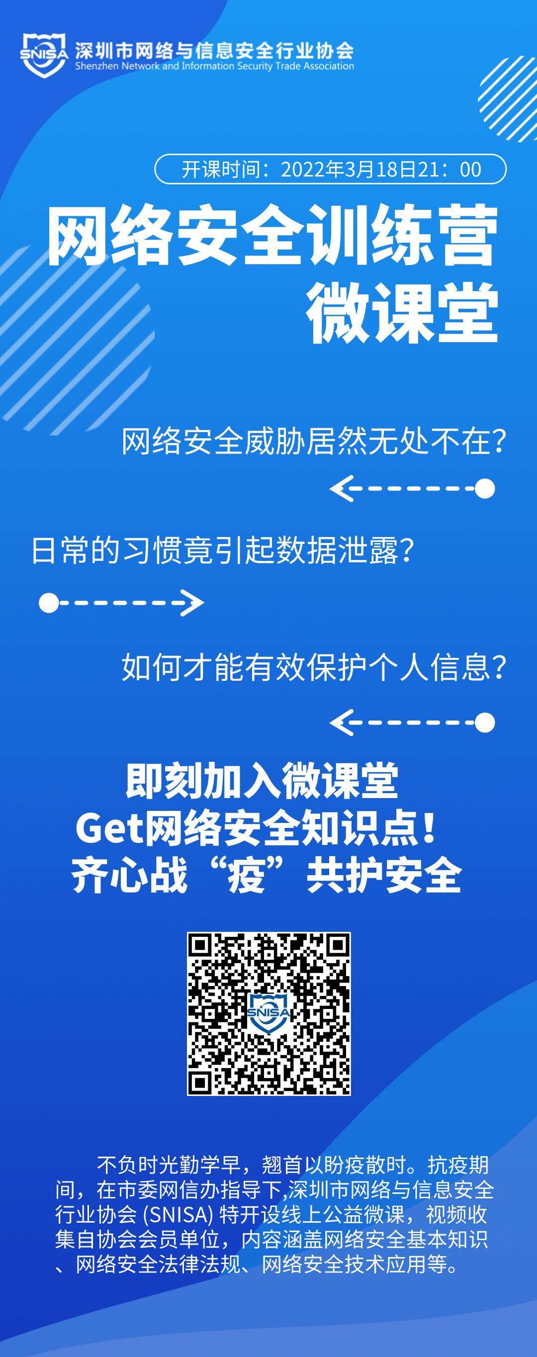 要打好网络安全“防疫战”,技术支撑为主,网民们的网络安全意识也同样重要。居家办公如何有效保护个人信息,成为不容忽视的问题。疫情防控期间,市委网信办联合深圳市网络与信息安全行业协会等社会组织力量,特开设线上公益微课。公益微课内容涵盖网络安全基本知识、网络安全法律法规、网络安全技术应用,用视频解读和动画的形式向市民开设科普课程。