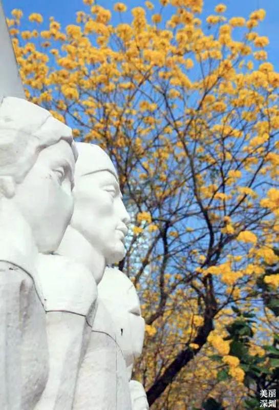 和医护人员雕塑相互映衬,满树花开
