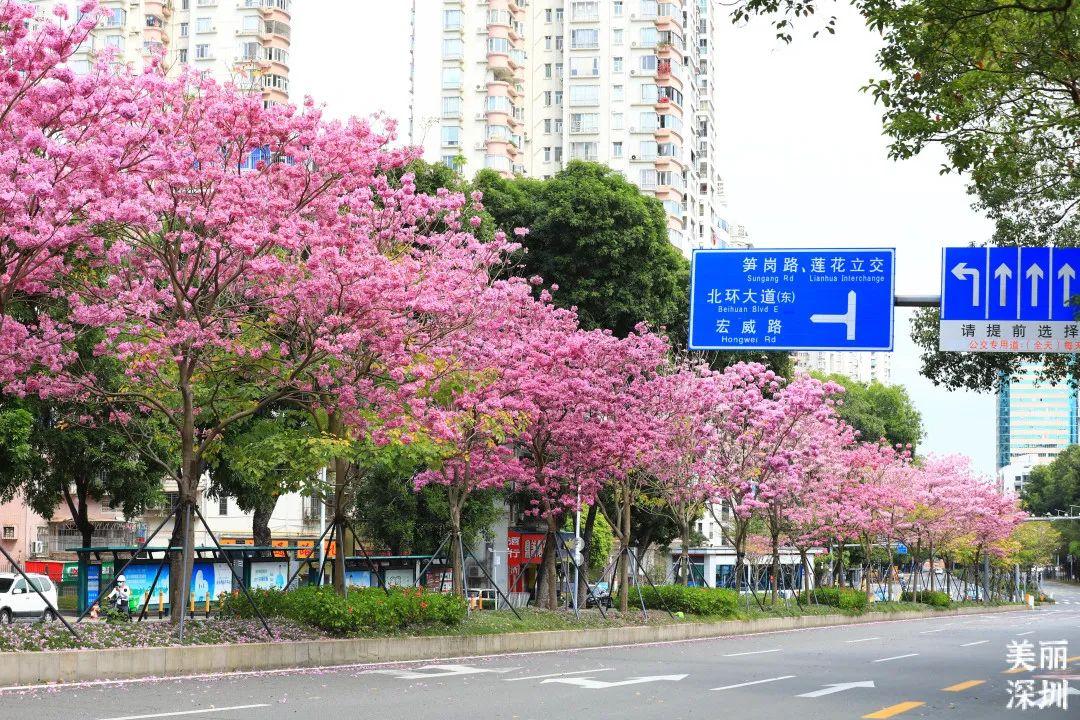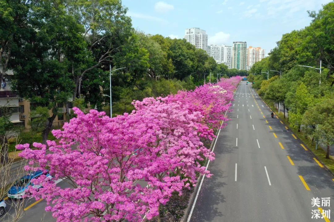 中心公园里的洋红风铃木也如期盛开