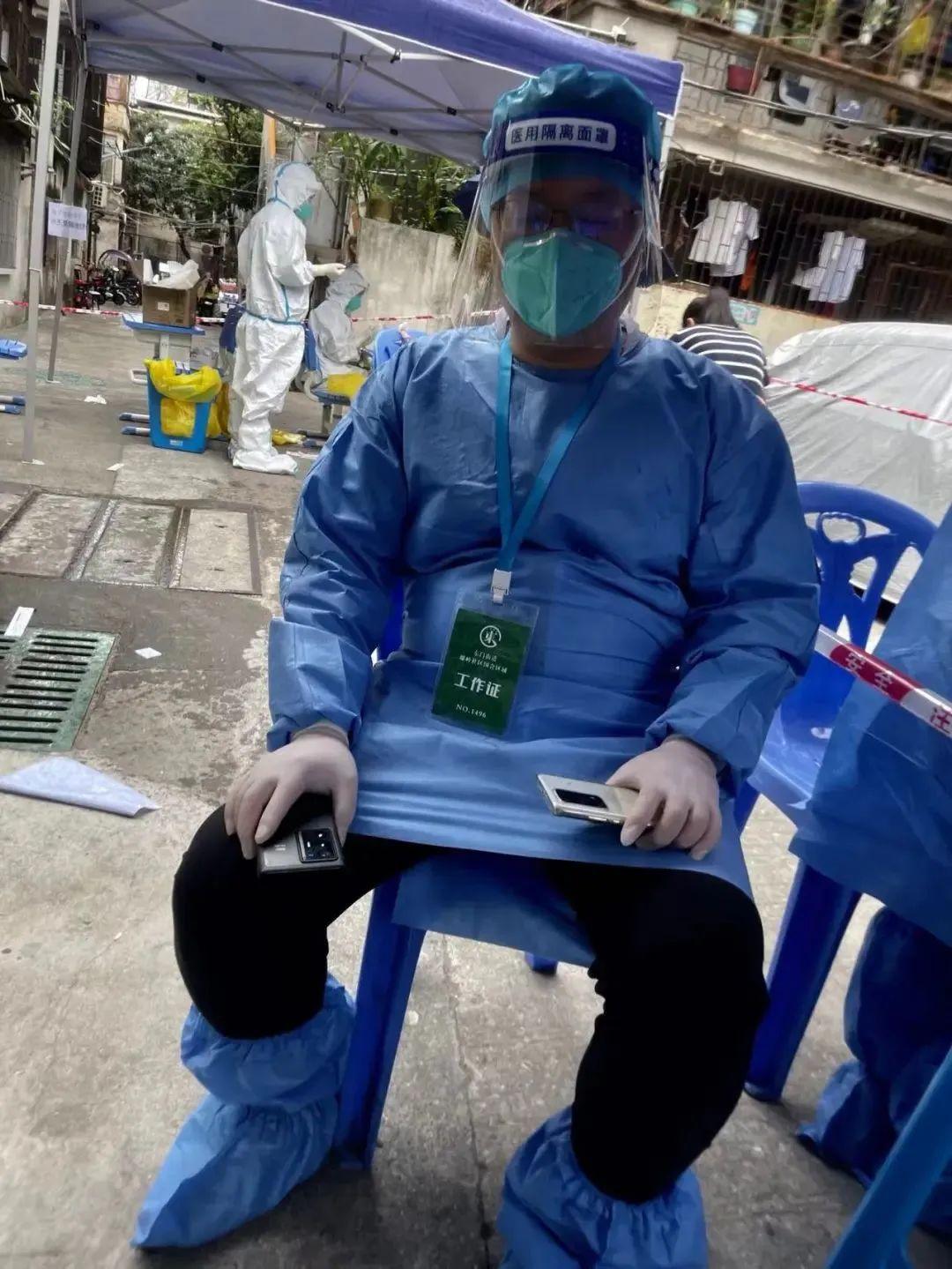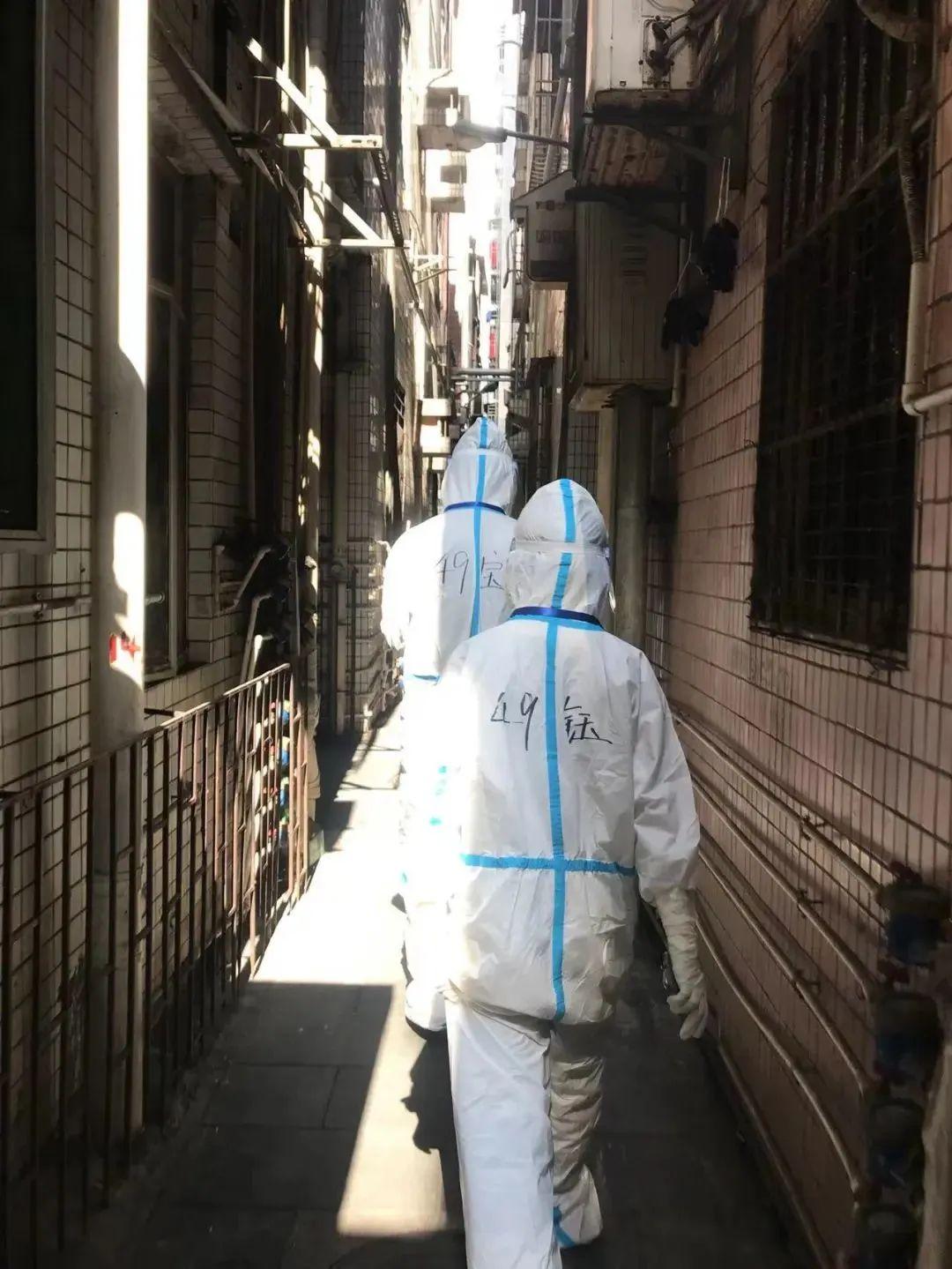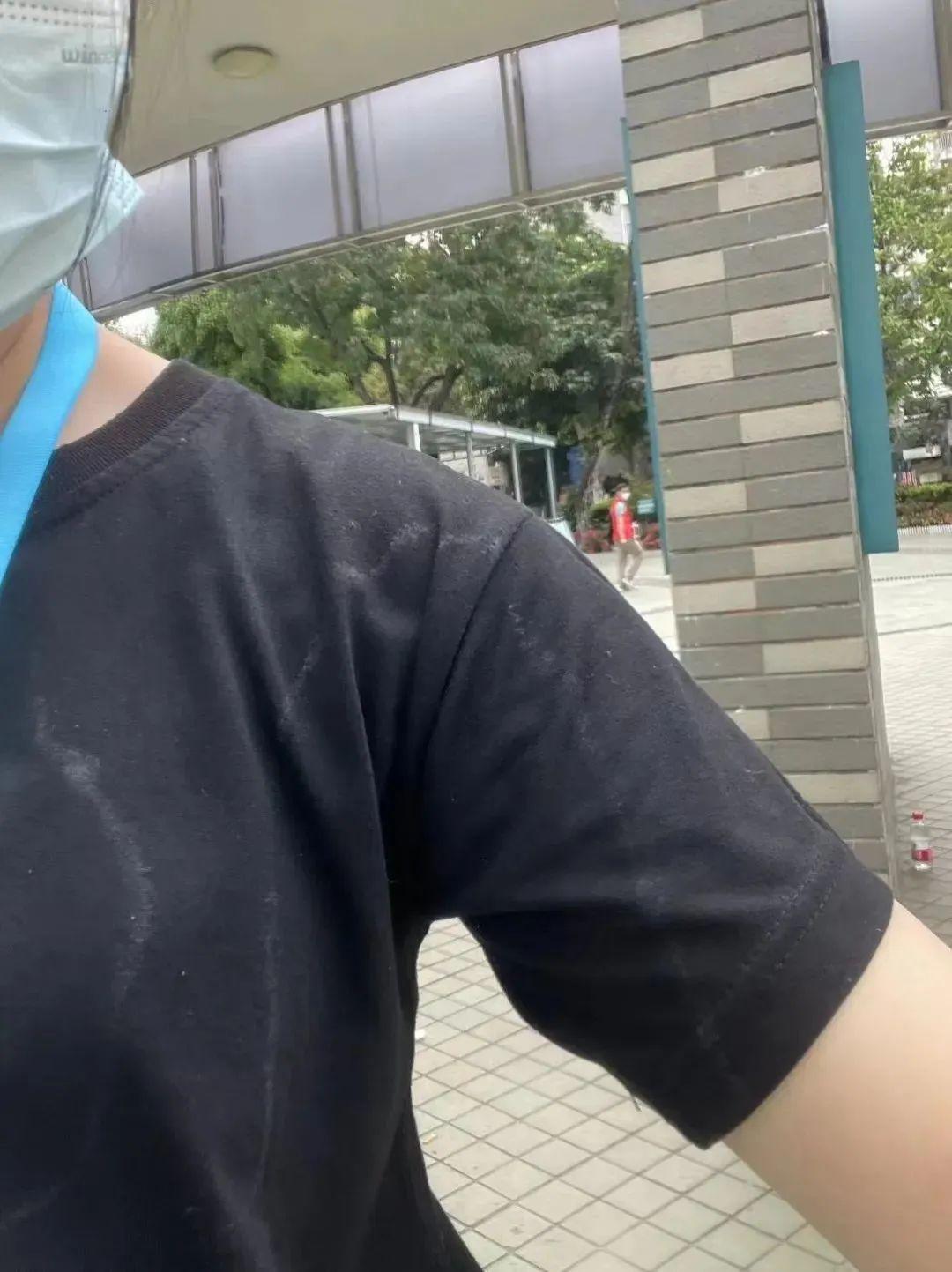 天气炎热,防疫“战士”每天要穿着防护衣站立5-7个小时,挨家挨户爬楼登记,扛着大袋物资上门扫码,搭建布置核酸采样点,不停穿梭在楼栋之间维持防疫秩序,体力被不断消耗,直到水汽裹衣。