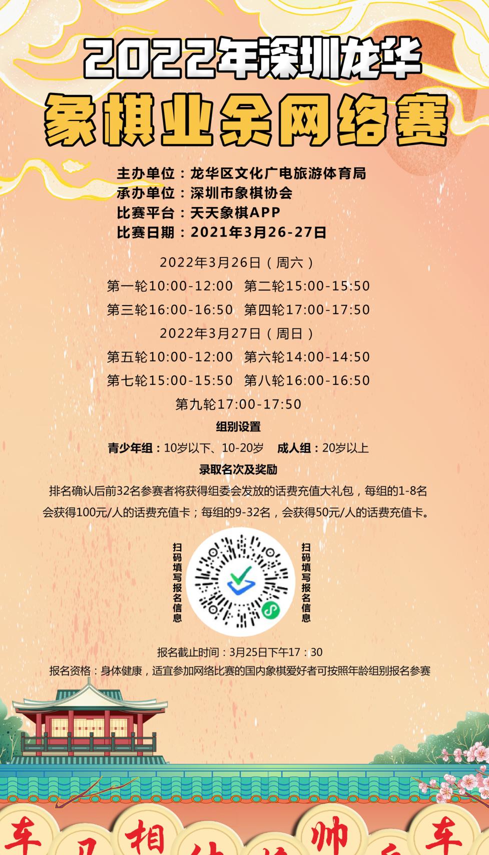 进一步丰富我市广大市民的业余生活,继承和发扬中华民族的优良文化传统,正确引导市民的思想政治文化,提高文化修养和道德素质,增进友谊、建设和谐深圳,现组织开展2022年龙华区线上运动月系列活动之象棋业余网络赛。