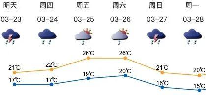 22日早晨至下午多云暖湿,有分散(雷)阵雨,傍晚到23日有雷雨,雷雨时伴有6-7级短时阵风,气温下降,天气显著转凉。