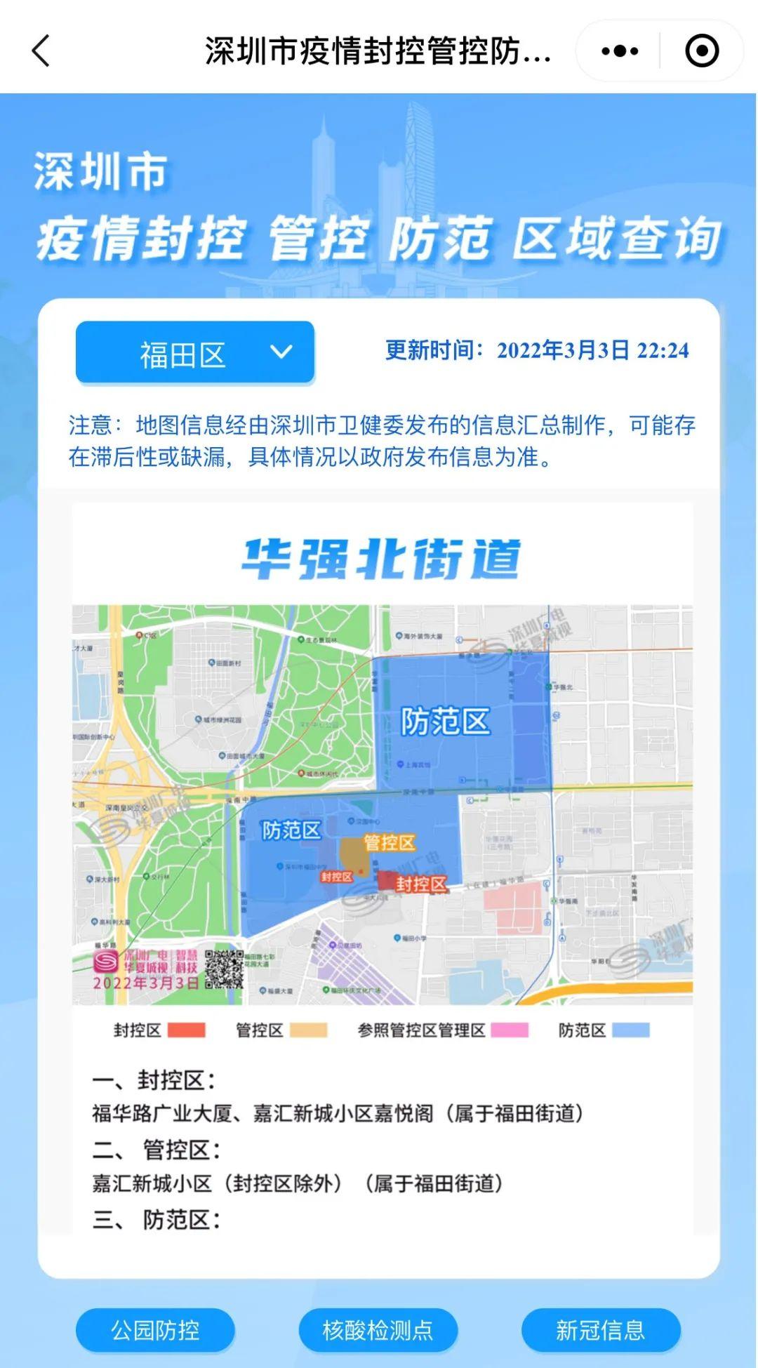 点击“疫情防控地图”进入页面,可一键查询深圳市各区的疫情封控区、管控区、防范区分布情况。