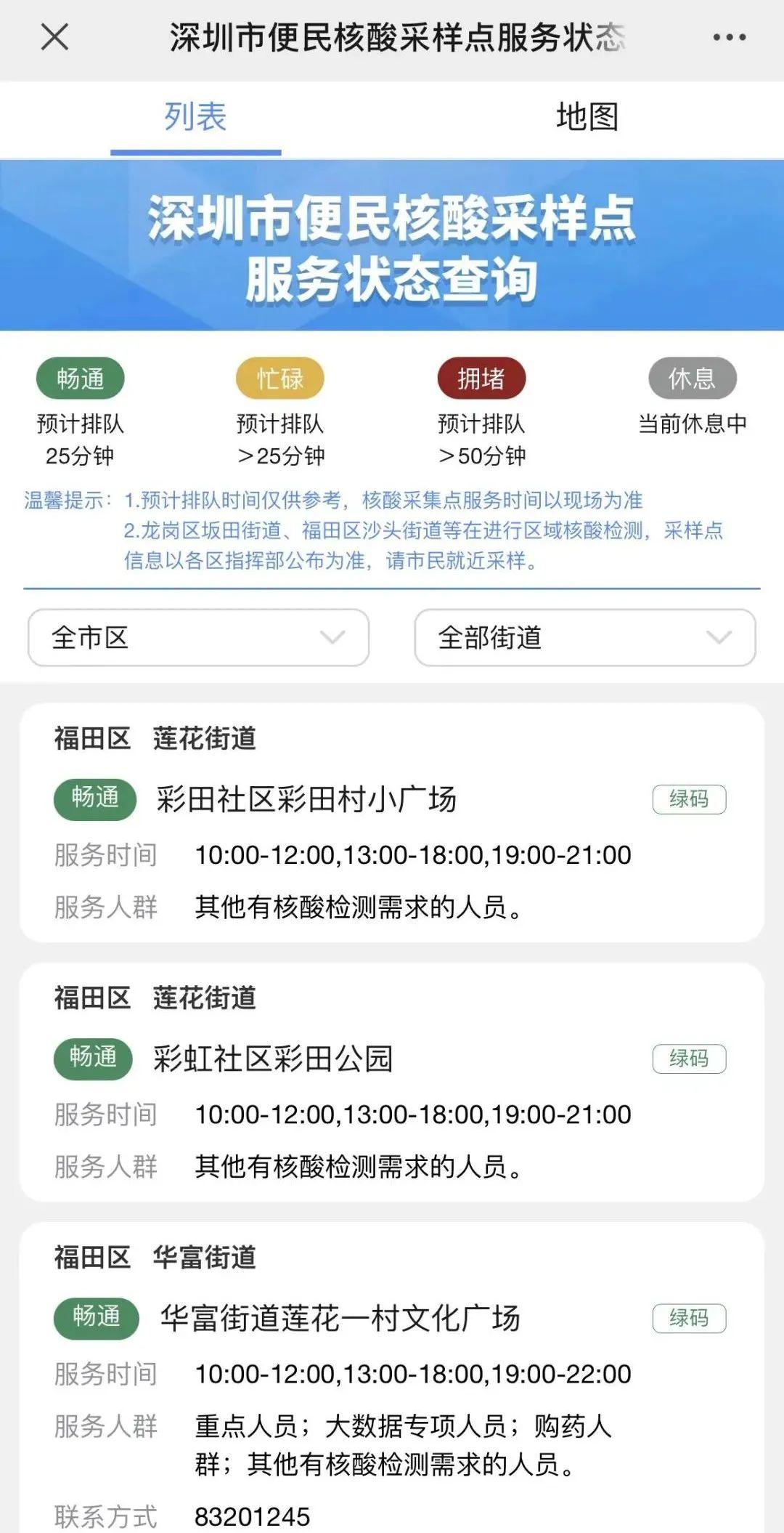 点击“核酸采样点查询”进入页面,可快速查询深圳市便民核酸采样点服务状态,繁忙程度直观可见,一键导航方便快捷。(鸣谢中国移动深圳分公司提供技术支撑)