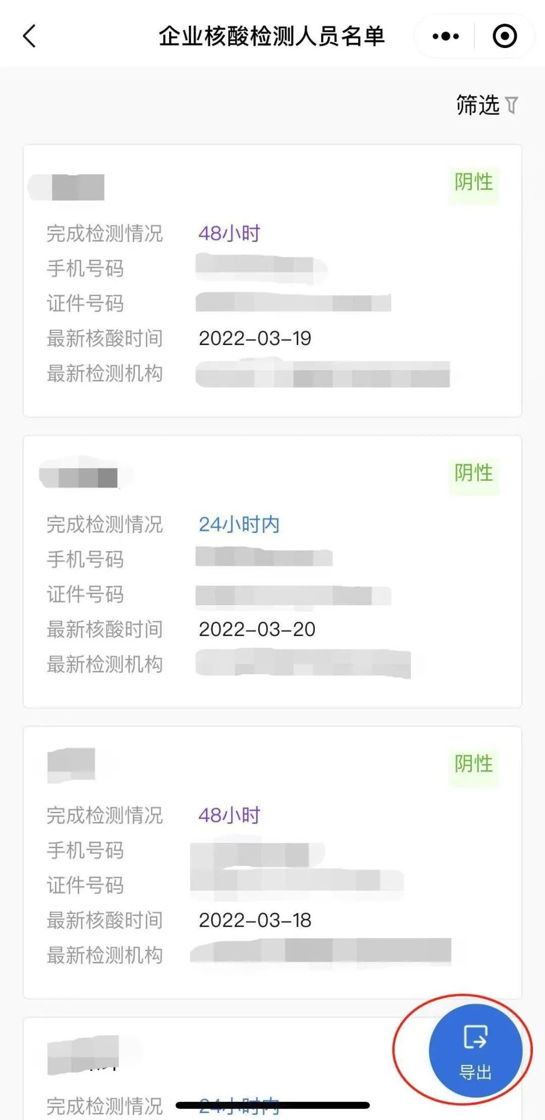 点击对应“24小时内”“24~48小时”“48~72小时”“超72小时”等分类,查看对应时段员工核酸检测情况