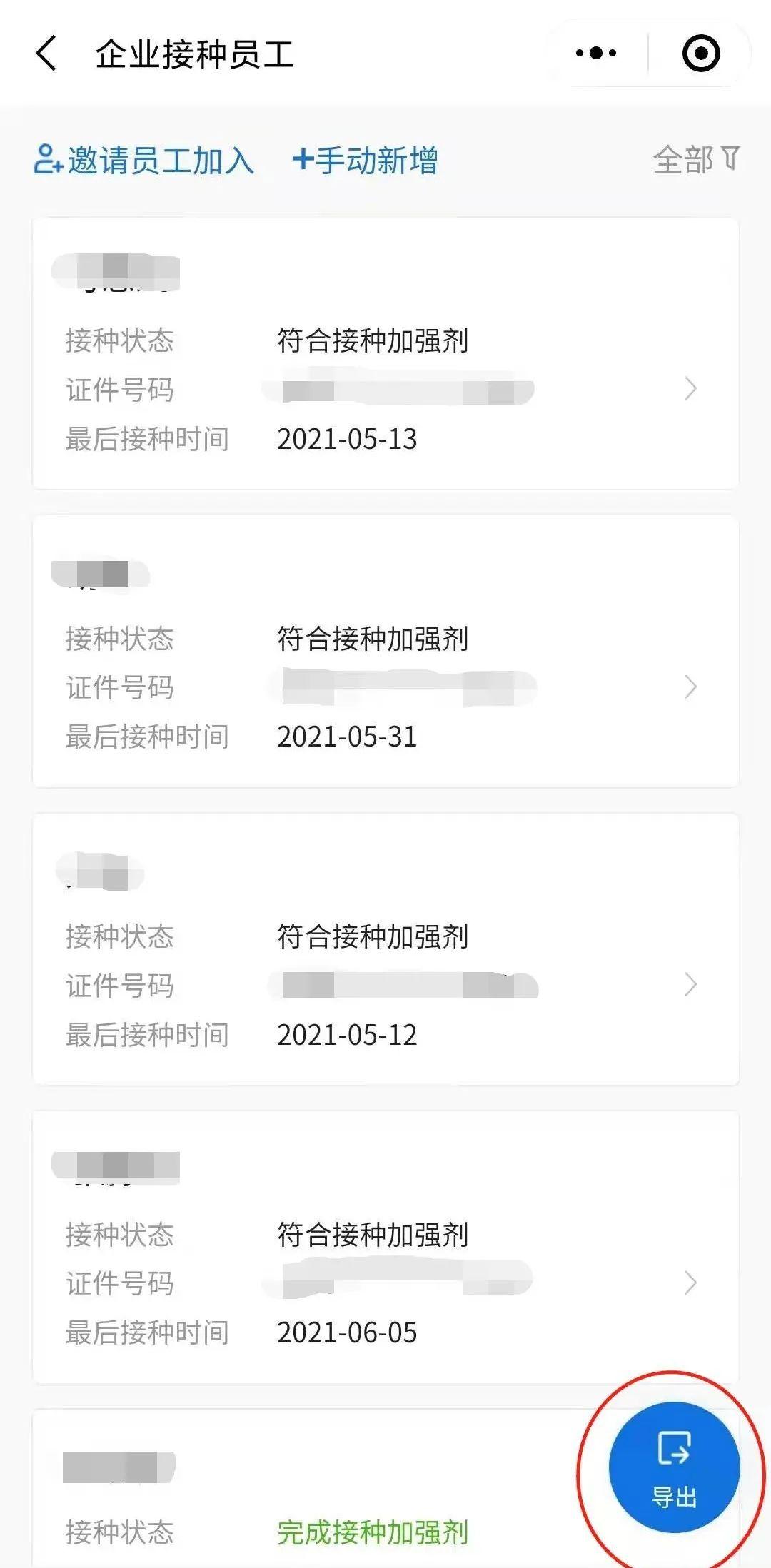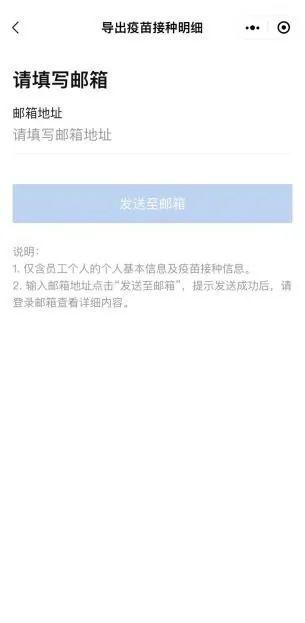 如需导出企业员工疫苗接种明细,可返回上一页。点击左下角【导出】,填写邮箱地址,可将对应数据导出到法人或经办人指定邮箱。