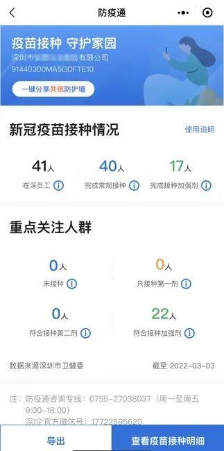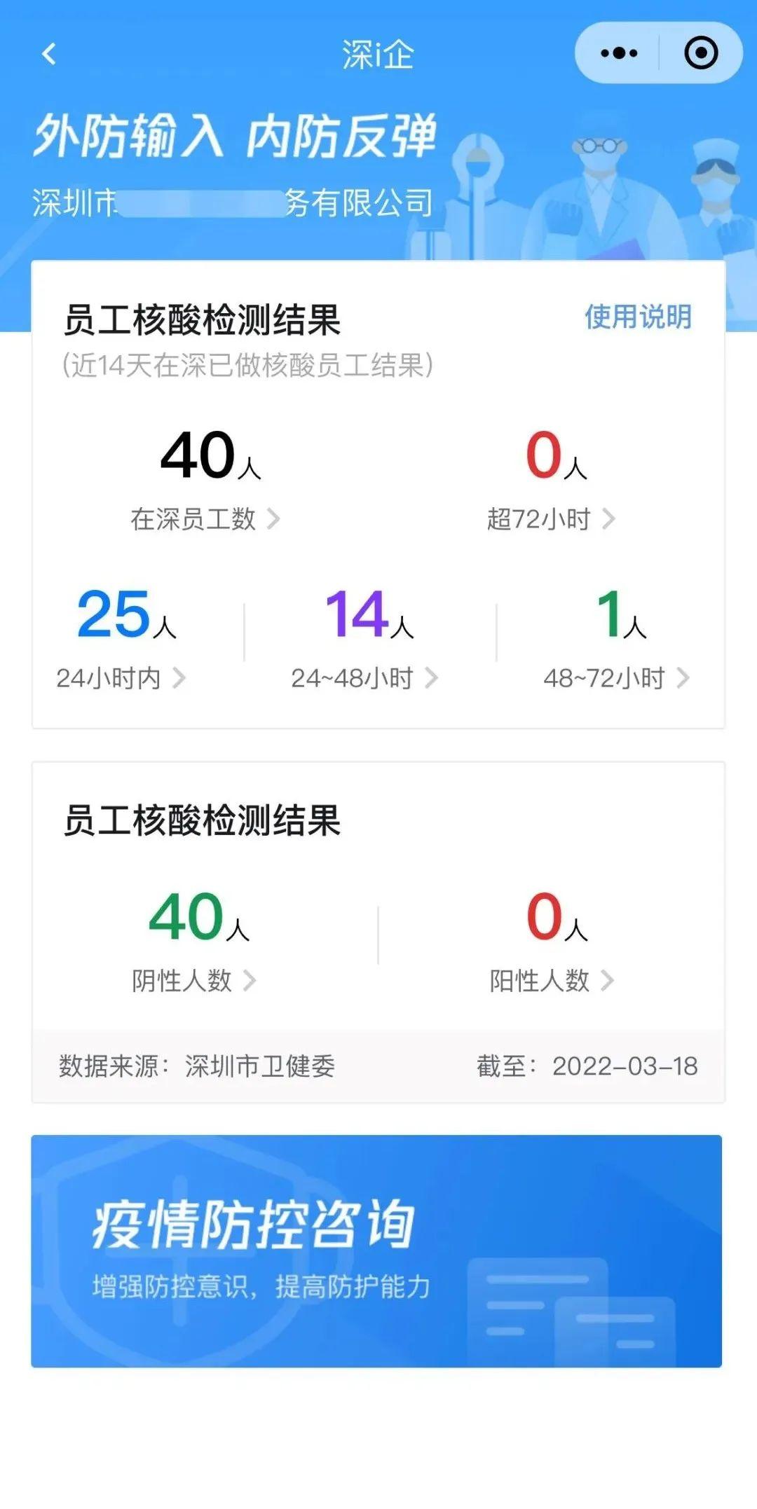 为助力企业科学抗疫、精准抗疫,在市工信局(市中小局)联合市政数局、市卫健委、市人社局的支持下,“深i企”不断升级优化“防疫通”服务,目前已上线核酸检测告警系统、核酸检测信息查询、疫苗接种信息查询等功能,无需企业投入精力开展管理工作,进入系统即可掌握本企业员工疫情防控动态信息。