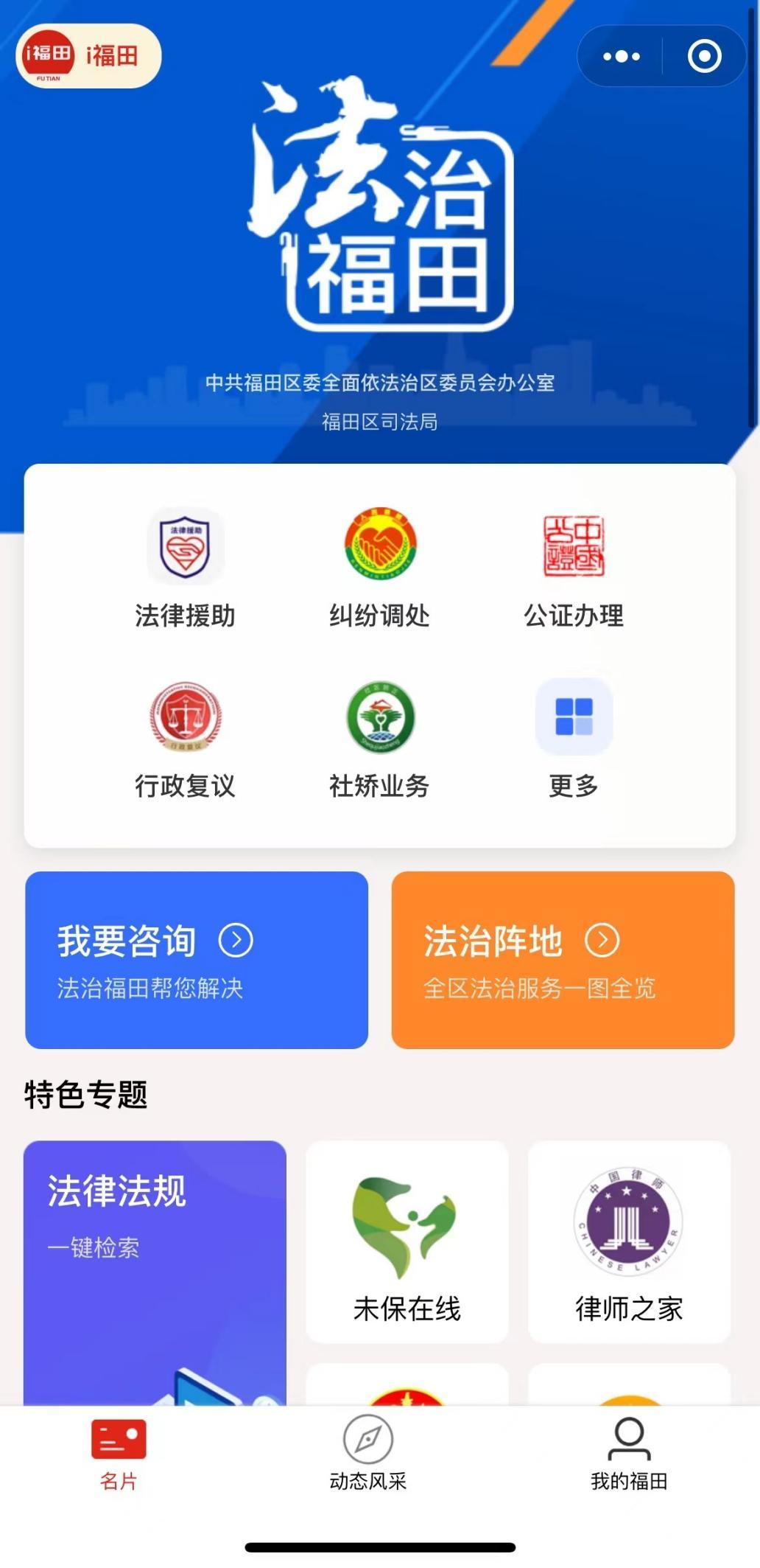 包括“法治阵地”“法律法规”“学法之窗”“以案释法”等资讯类内容,也包括“我要咨询”“法律援助”“公证办理”“行政复议”“社矫业务”“未保在线”“律师之家”“为军服务”等业务服务类内容。此外,还有展示福田区法治建设成效与亮点的“动态风采”板块。其中,常用的公共法律服务均可提供24小时的在线咨询。