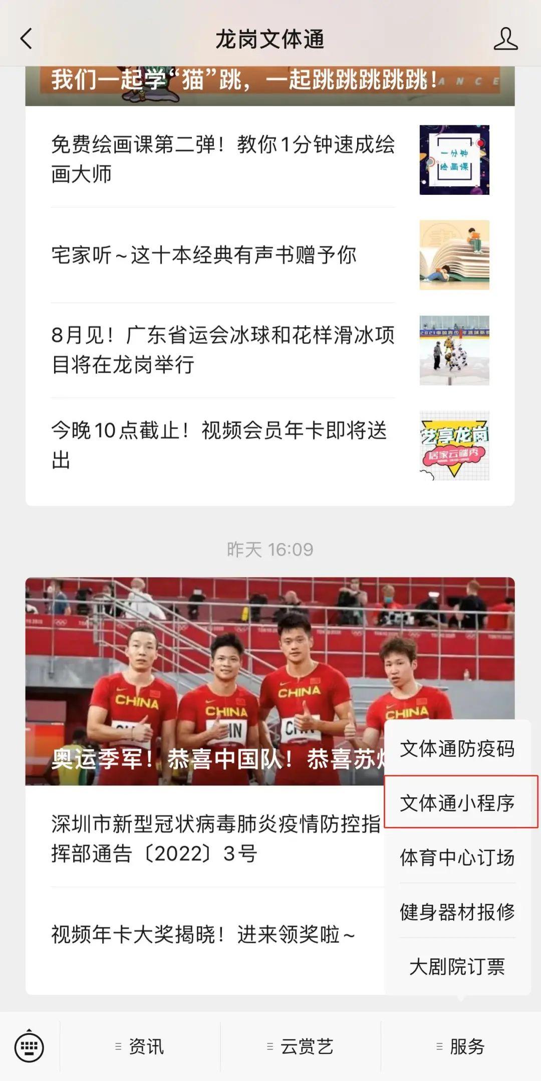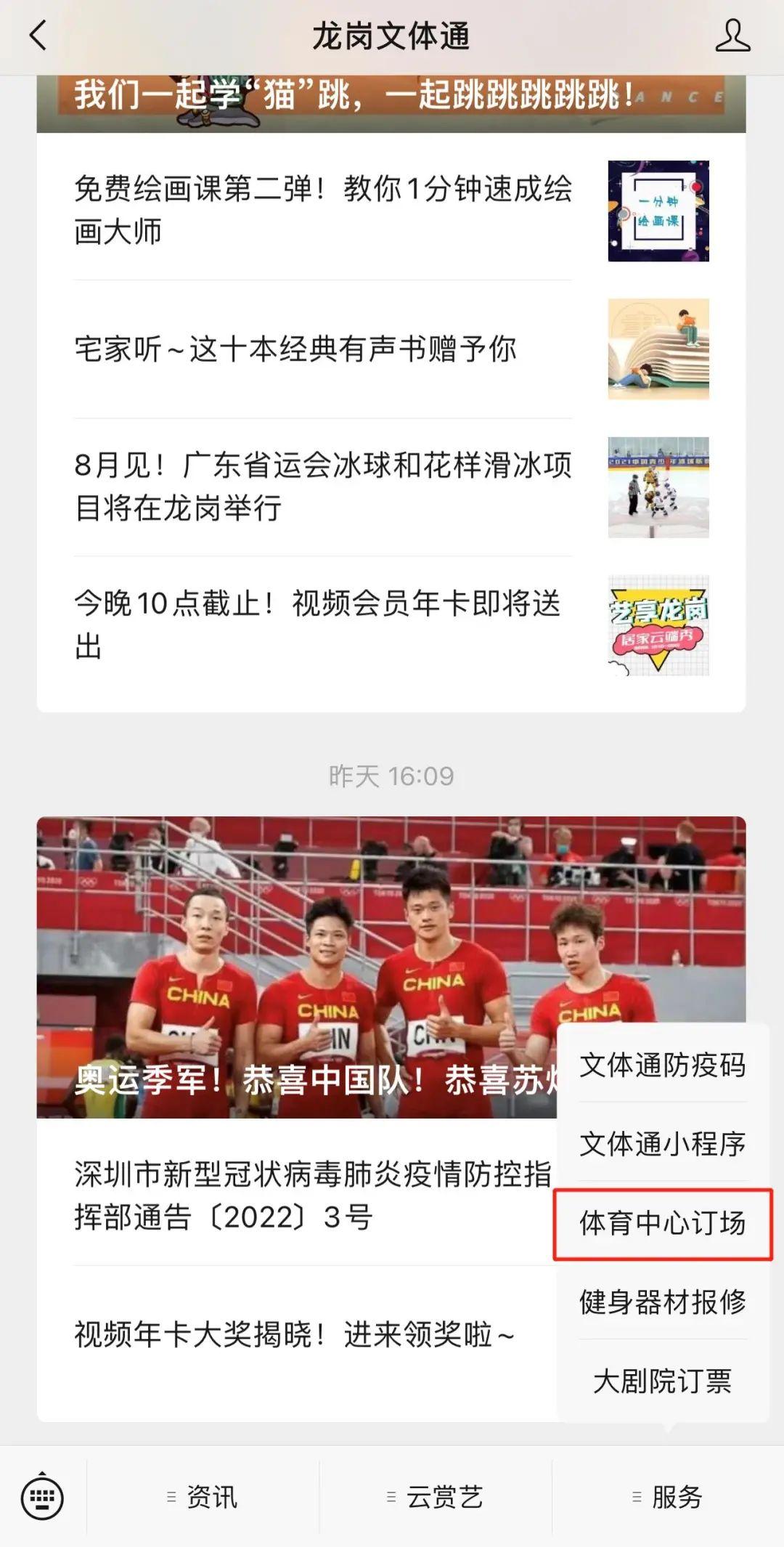 进入“龙岗文体通”公众号,点击子菜单“服务”—“体育中心订场”