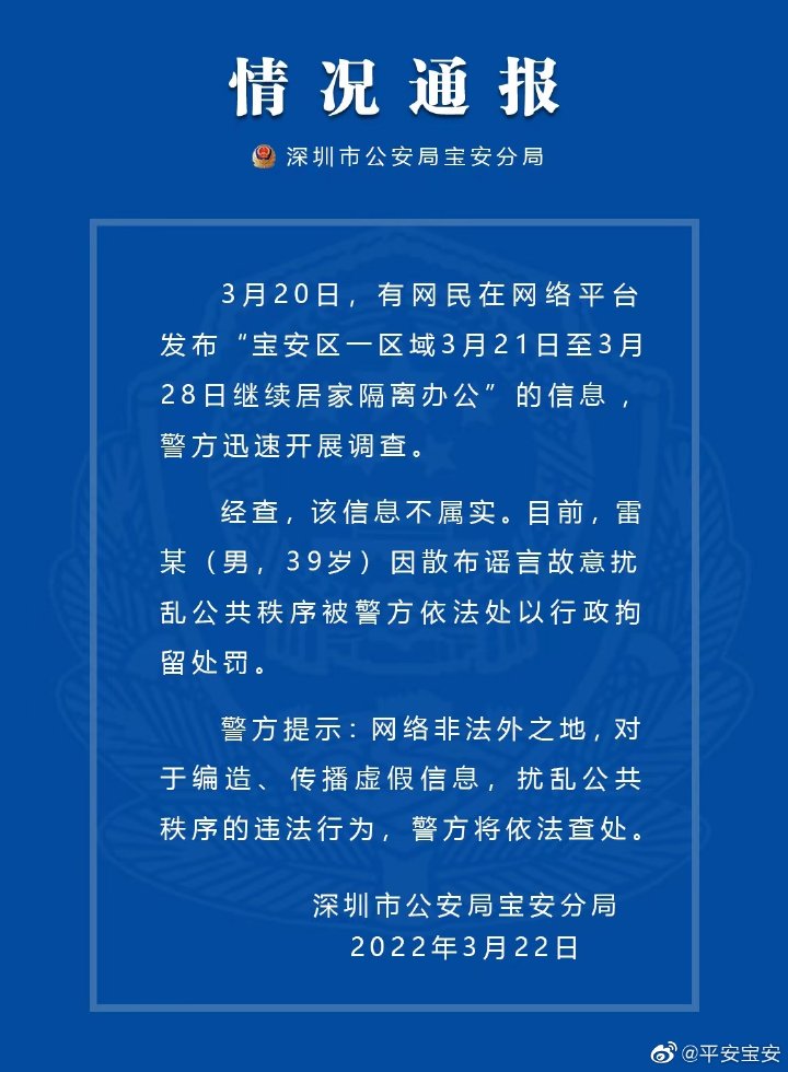 3月20日,有网民在网络平台发布“宝安区一区域3月21日至3月28日继续居家隔离办公”的信息,警方迅速开展调查。