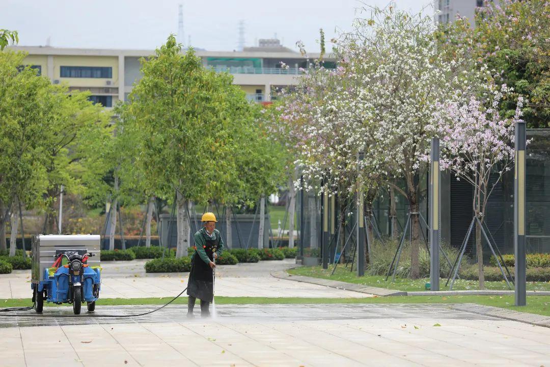 环卫工人正在用水冲洗地面。