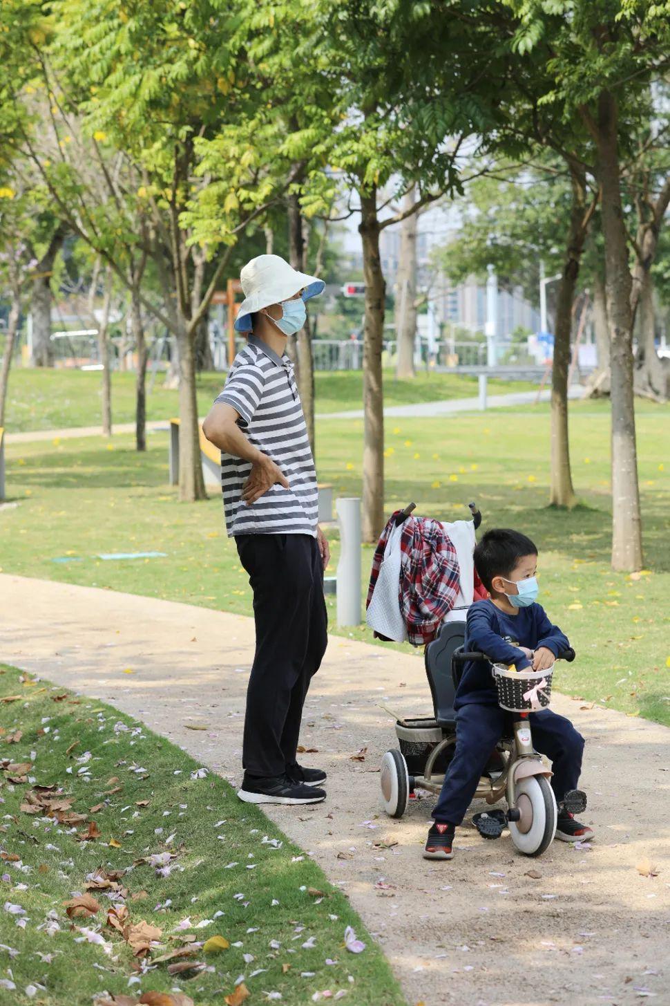 在园区的休闲区域,也有老人带着小孩出来玩乐。
