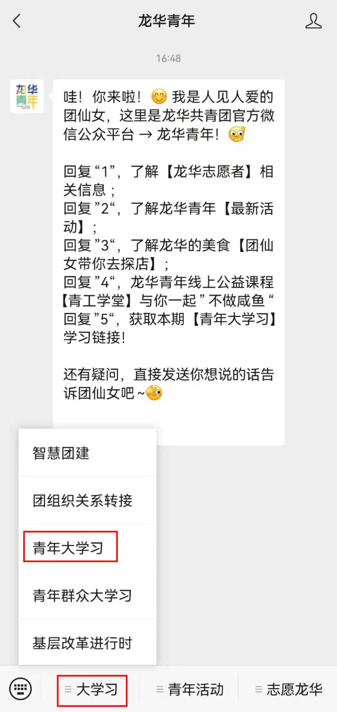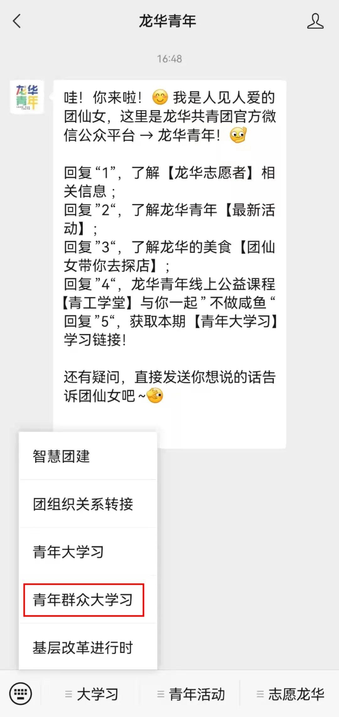 点击公众号左下角“大学习”➩“青年大学习”