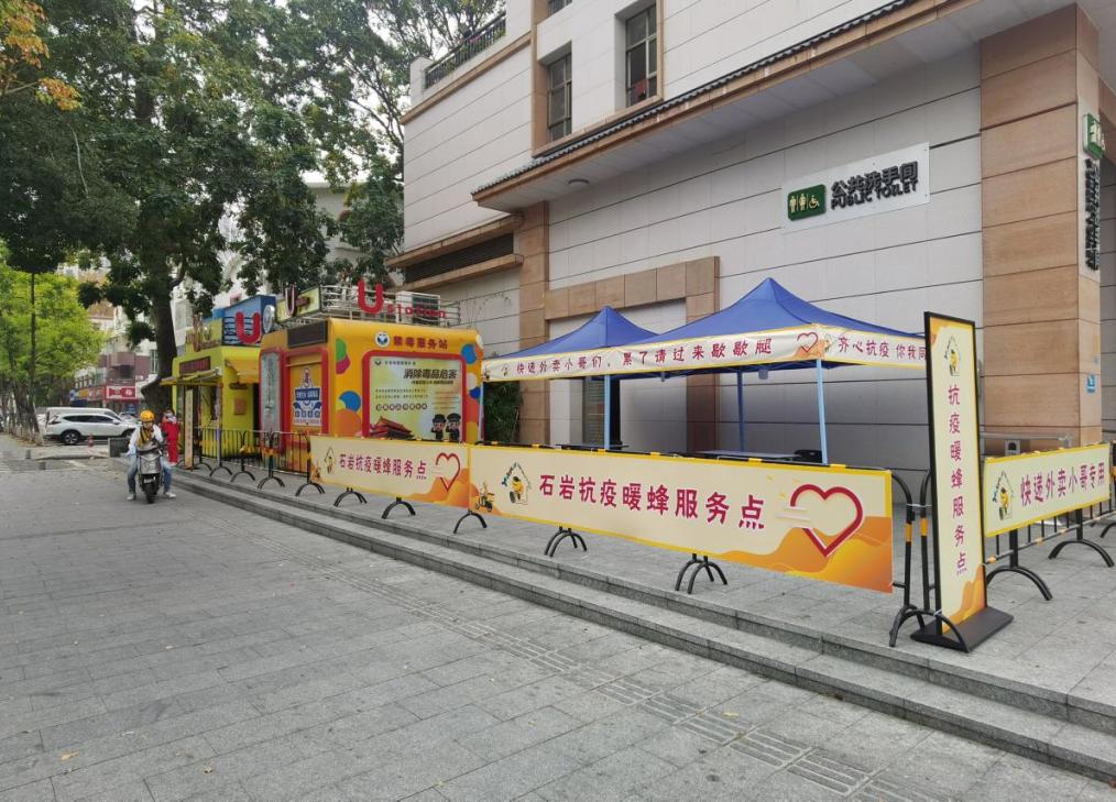 封控期间,很多骑手无法回家,针对骑手在配送、住宿等方面的难题,石岩街道快递物流行业党委快速行动,拟定针对性措施,切实开展暖心服务外卖骑手行动。协调街道迅速开放暖蜂驿站,根据小区防控情况,在外卖骑手等保供从业人员集中的石岩会堂边增设抗疫暖蜂服务点,在上屋小学体育馆设置骑手临时安置点,为外卖骑手提供休憩、充电、咨询等服务项目,并免费提供热水、泡面、矿泉水、免洗消毒液、防疫中药包等物资。