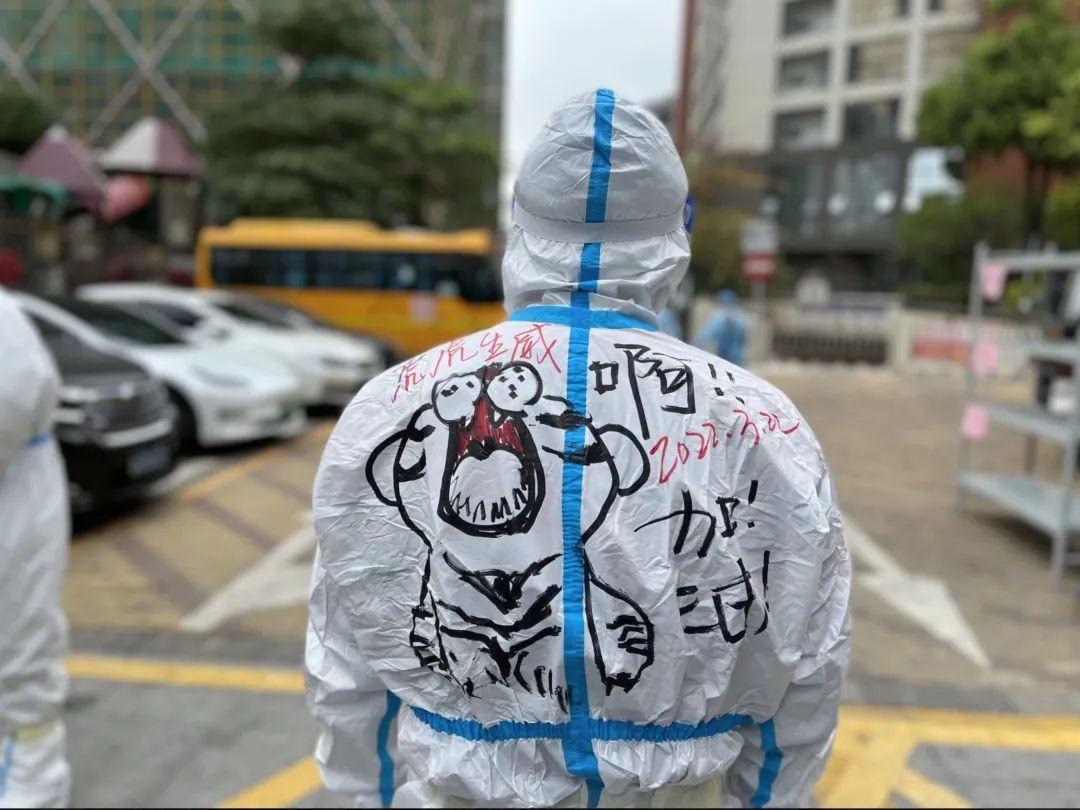 3月22日,前海湾花园小区负责核酸检测的医护人员穿上了一件特别定制的“大白”——一只萌态十足、张大嘴巴的小老虎在防护服上栩栩如生,仿佛在对前来核酸的居民们说:快张嘴,啊~