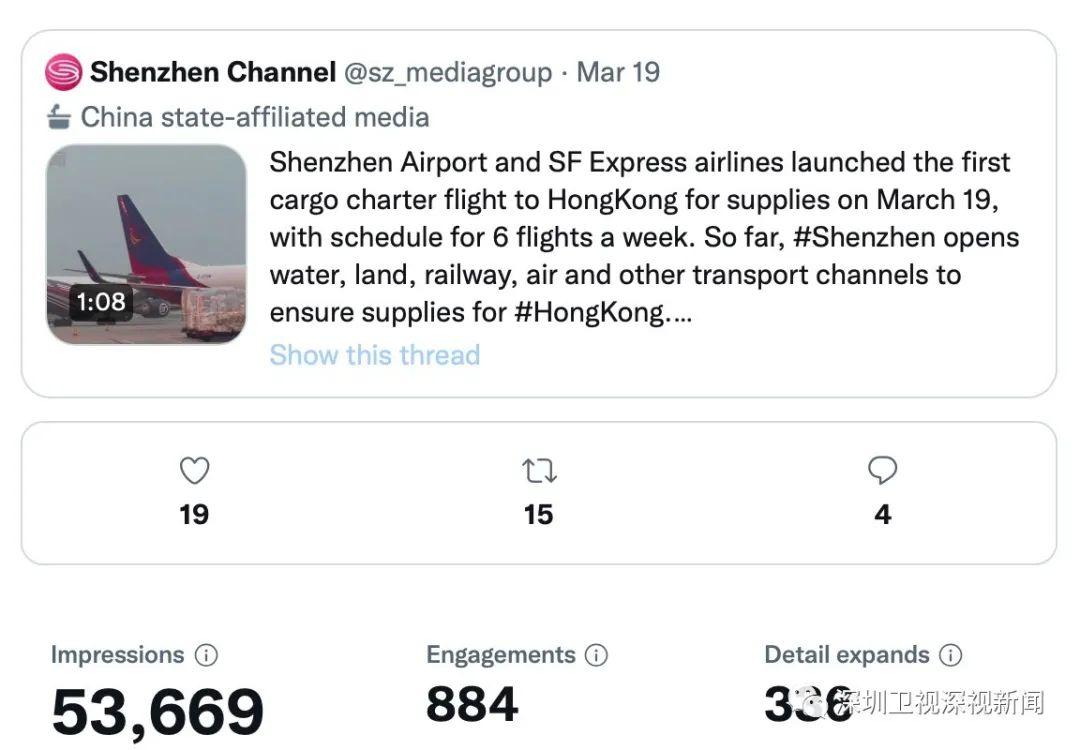 这则消息经深圳卫视直新闻和其旗下的“SHENZHEN CHANNEL”报道后,不但英文推文+视频的点阅量创下新高,还引起了美国彭博社、香港南华早报等境外英文媒体记者的关注和转发。彭博社是全球最大的财经资讯公司,南华早报是香港销量最高的英语报纸。