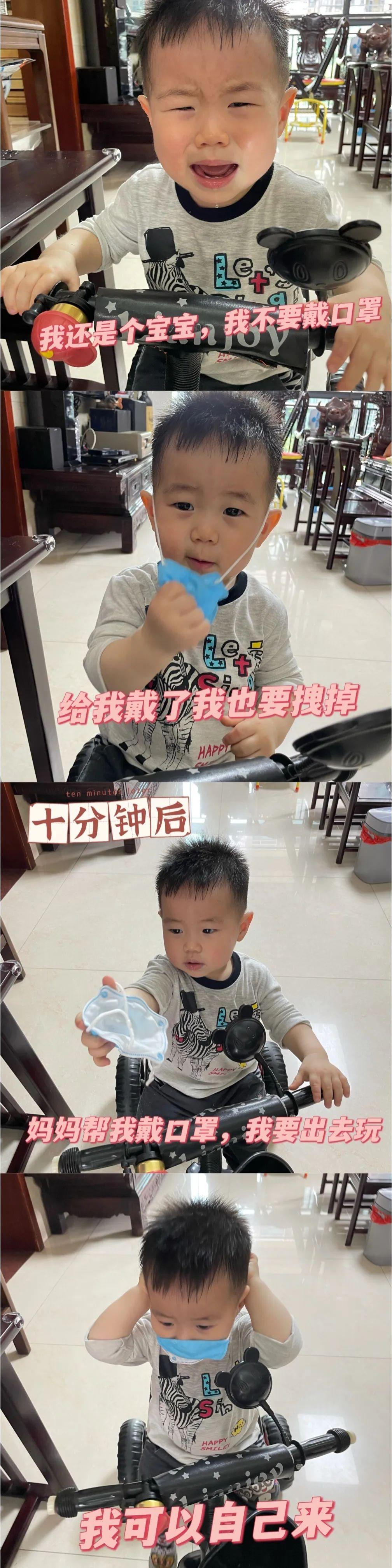 宝宝自出生起就与口罩打交道,每天和口罩“相爱相杀”。居家抗疫的日子,只有做核酸的时候能带娃出门“放风”。一听到要戴口罩,宝宝第一反应就是哭,刚戴上口罩就被他一把拽下。我说:“那你面壁思过吧!”过了10分钟,宝宝自己主动把口罩拿来让我给他戴上,其实就是想要出去玩,小心思被我一眼看穿。我说:“你能耐着呢,那你自己戴吧!”于是他还真的自己动手努力戴好口罩。大家都要记得出门戴口罩哦!