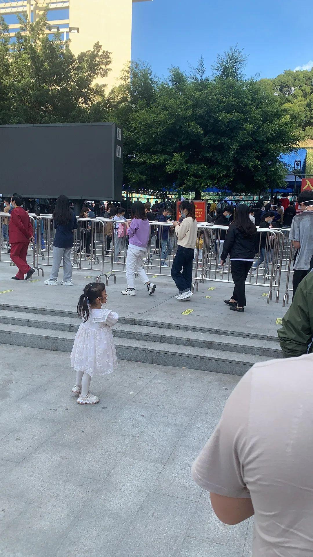 照片拍摄于龙岗区坂田街道杨美社区旺塘篮球场核酸采样点,一个小女孩把双臂抱在胸前,踮脚探头看着核酸检测队伍,像是在检查大家是否有排好队,超可爱!大家在核酸检测时一定要排好队,保持一米距哦~
