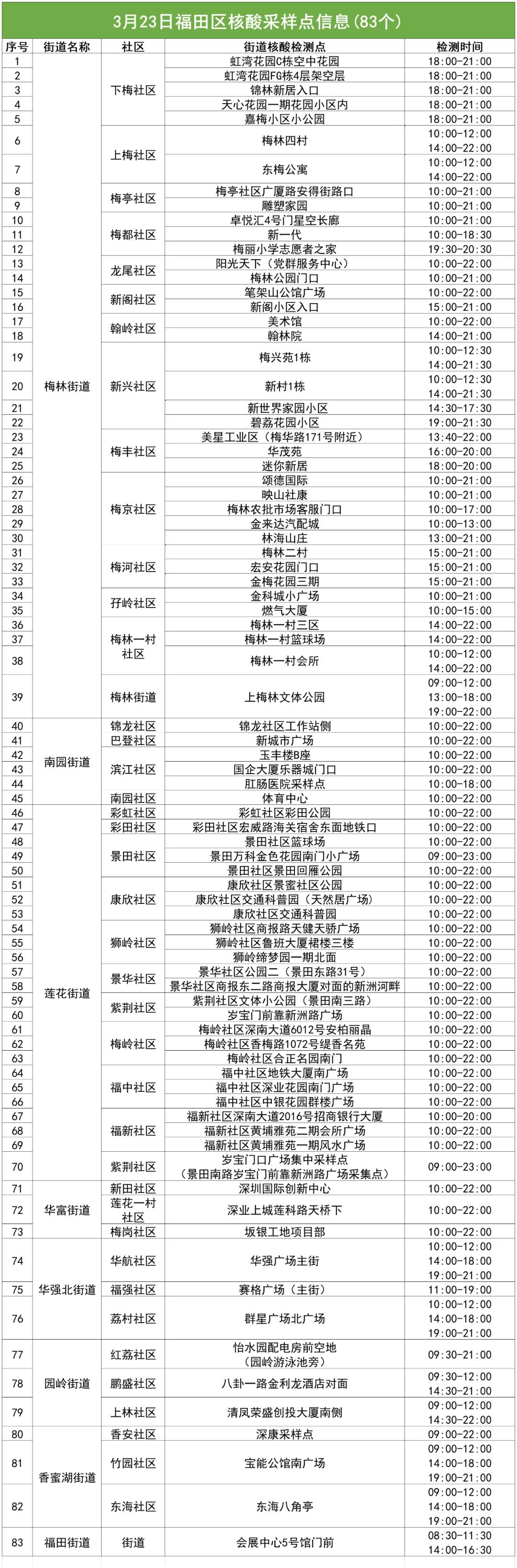 为方便居民进行核酸检测,3月23日,福田区设置83个免费的核酸检测采样点,为居民提供服务。