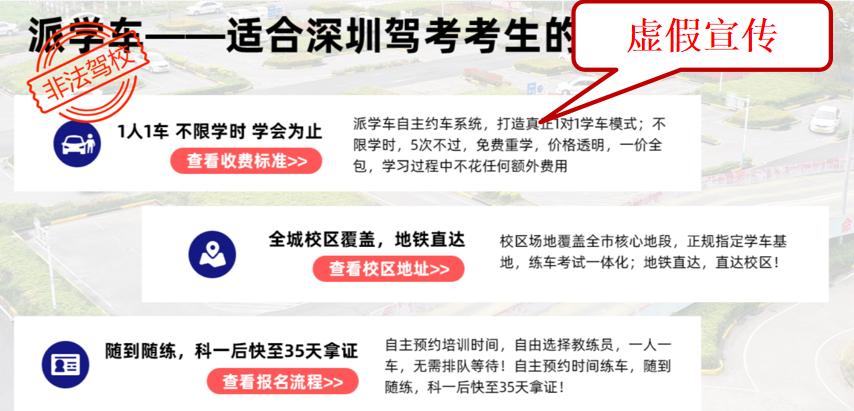 当前,数家未取得经营许可也未进行备案的无资质驾校(如派学车、深南驾校、众友驾校等),在深圳市进行非法招生活动。