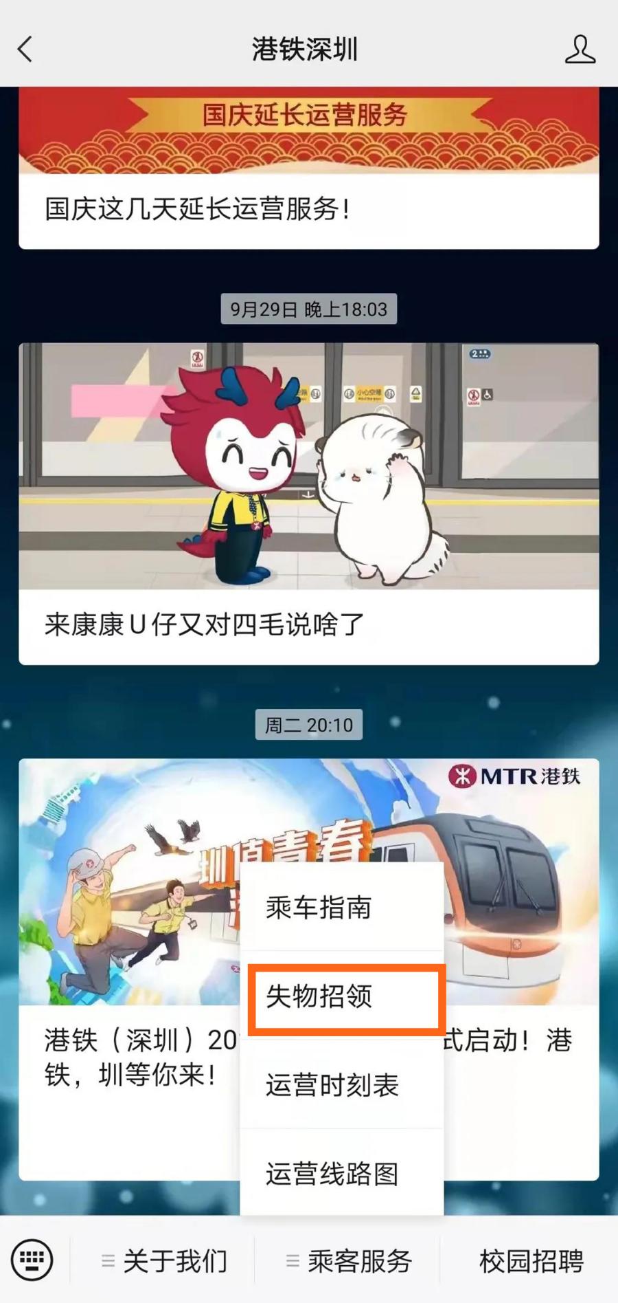 如果你是回家才发现东西落在地铁上了的朋友,请打开公众号,点击「失物招领」服务。(“深圳地铁” 或 “港铁深圳”公众号)