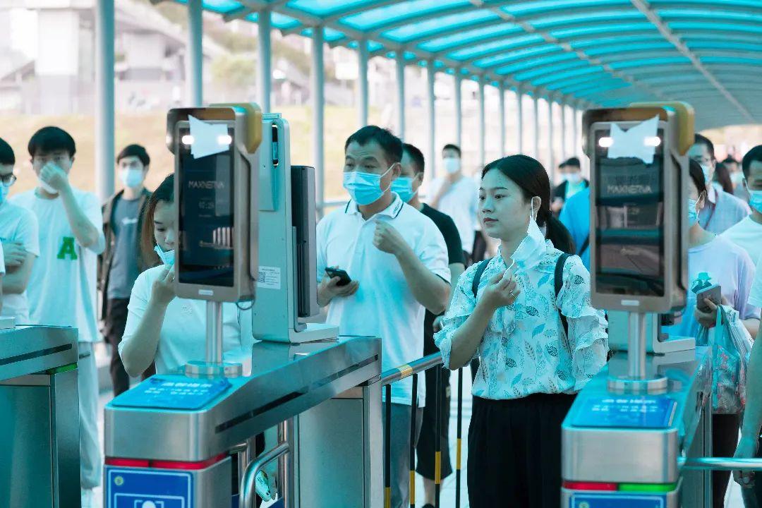 富士康园区,员工们有序排队打卡上班。