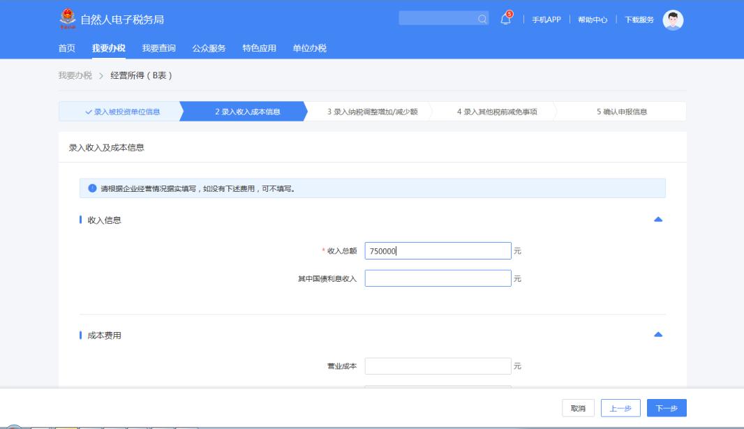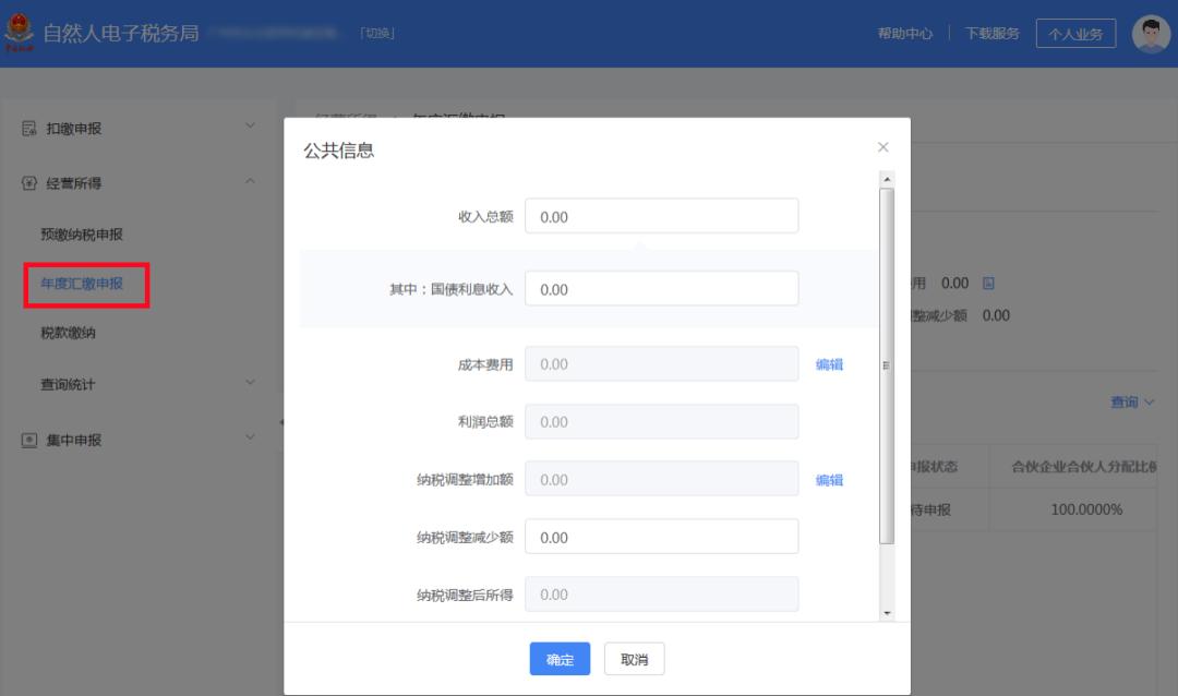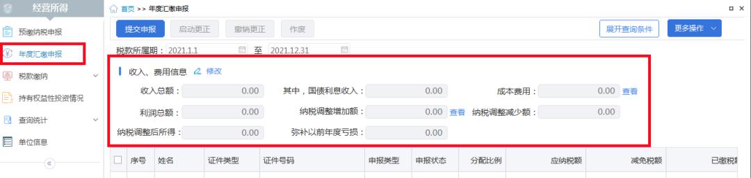 点击左侧的【年度汇缴申报】进入申报表填写主界面,在“收入、费用信息”填写公共信息。若该税款所属期已有申报成功或待反馈的明细记录,则【收入、费用信息】不允许修改。