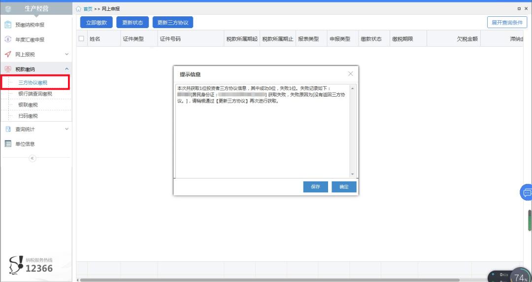 (1)【三方协议缴税】。首次使用“三方协议”缴税或更新过三方协议账户的,先点击【更新三方协议】,获取最新协议信息再进行缴款。投资人需要和税务机关、银行签订《委托银行代缴税款协议书》才能使用“三方协议缴款”方式,已经签订过的,不需要重新签订。