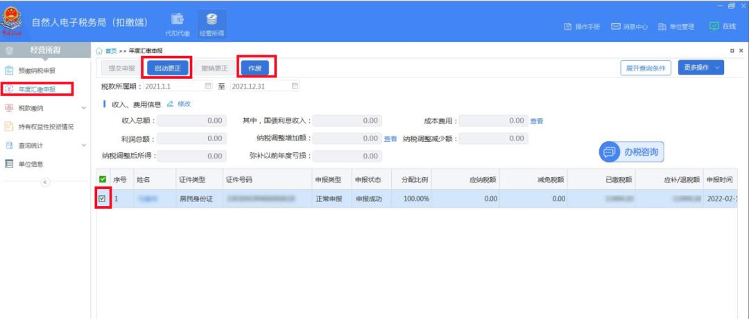 申报表报送成功后发现申报有误,可返回修正。点击【启动更正】,申报成功未缴款时发现有误可作废申报。