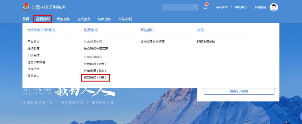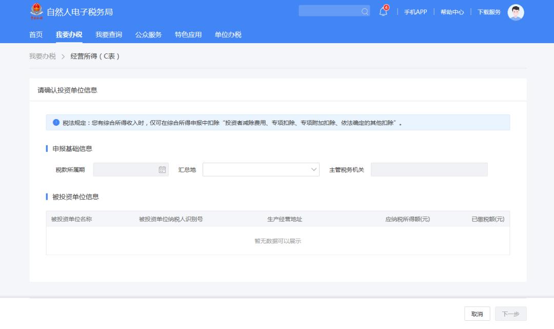 https://etax.chinatax.gov.cn),点击【我要办税】→【税费申报】→经营所得(C表),进入经营所得汇总纳税申报界面。