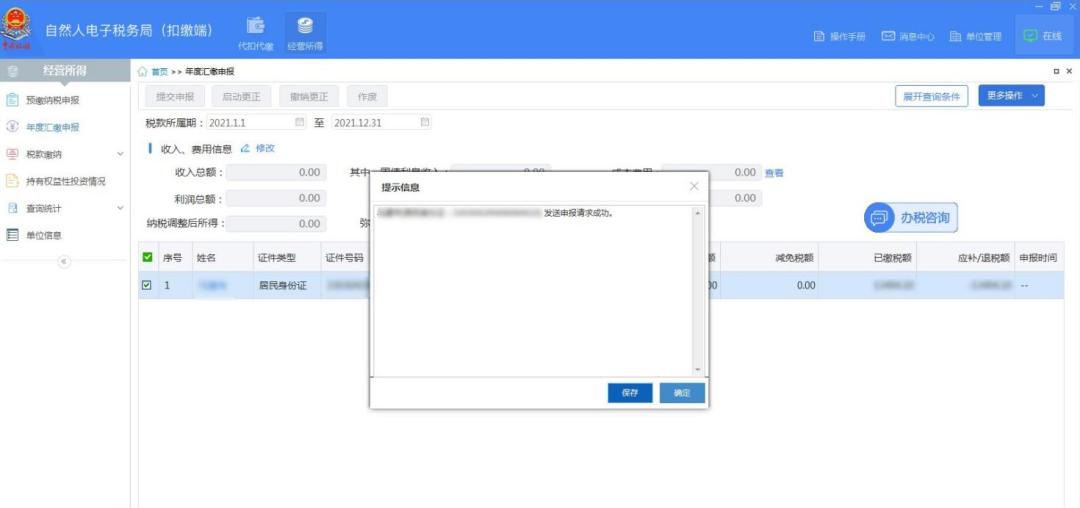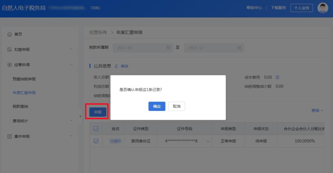申报表数据填写完毕,点击【申报】对该条申报记录提交申报。