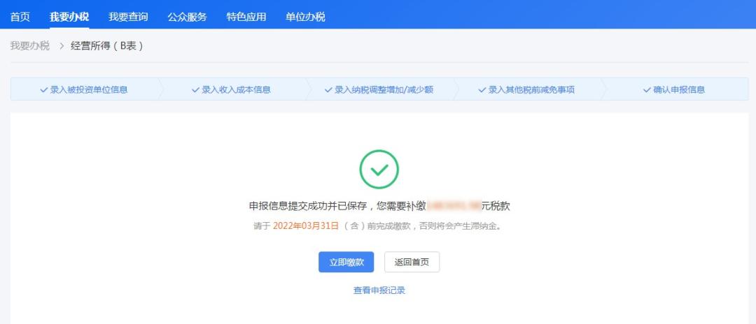6.确认申报信息后点击【提交】,可在申报成功的页面确认缴款。
