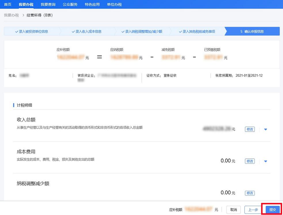 2.申报年度选择 “2021”,确认申报信息,系统将根据历史申报数据,自动归集需要调增的数据,纳税人可以修改报表的“应调整的其他费用”,如需调整“可减免税额”,须填报附表信息。确认数据无误后点击提交,可在申报成功的页面立即缴款或查看申报记录。